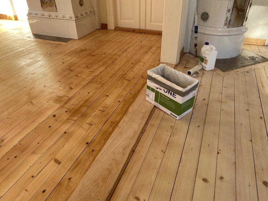 Slipat och lackat golv i nya huset. Till vänster efter första lagret, till höger nyslipat och städat. Lager nummer två i eftermiddag! Visa bifogad bild 114332