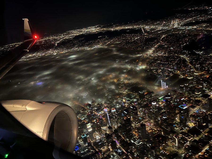 Gårdagskvällen inflygning med Alaska från SJC till LAX var en av de häftigaste inflygningar jag har haft på LAX. Cockpit varnade för lokal dimma med 400m sikt runt LAX. Precis över LA såg vi denna innan vi vände mot landningsbanorna. Parallell landning och så sjukt coolt att se det andra planet dyka ner i dimman.