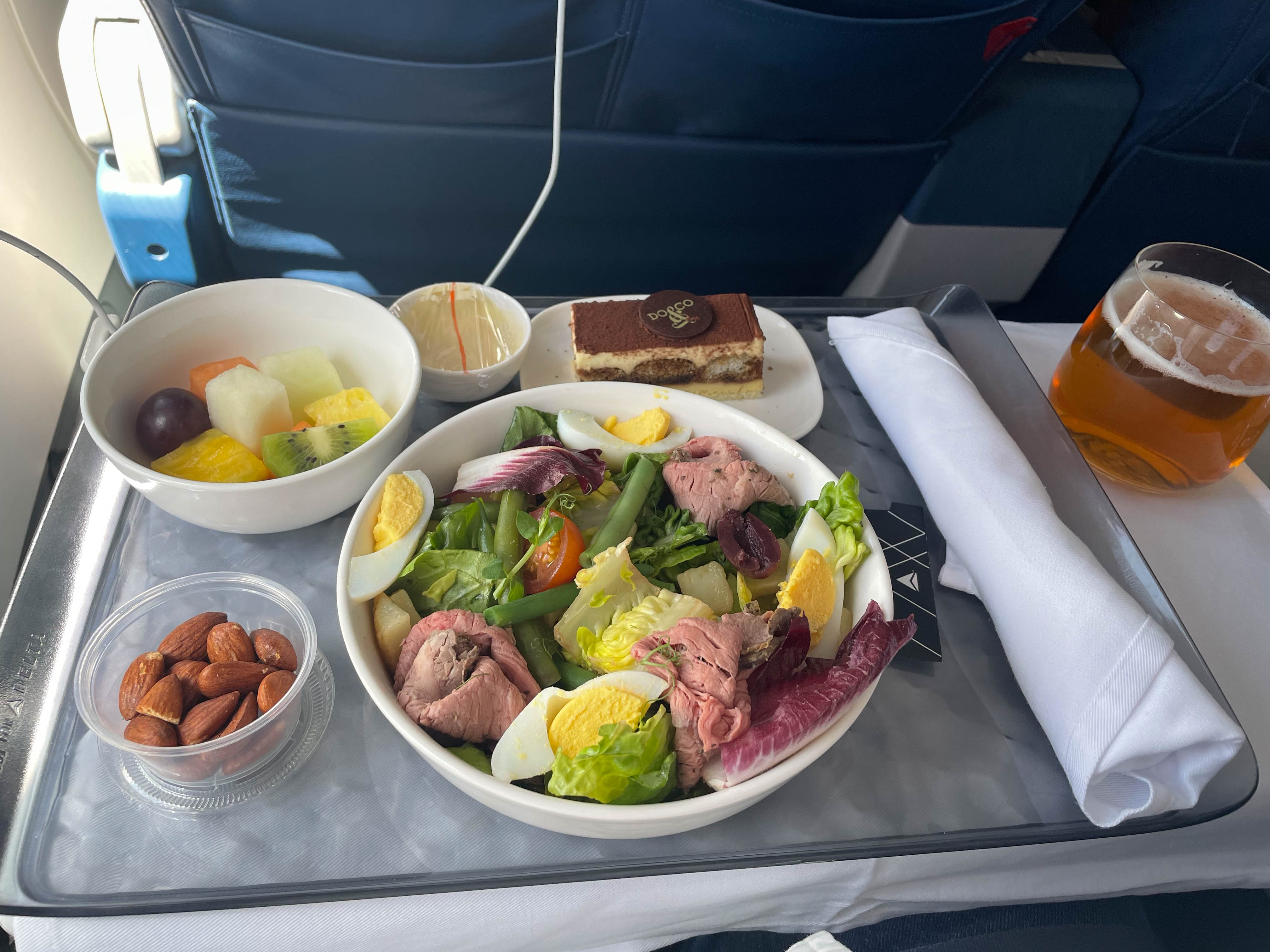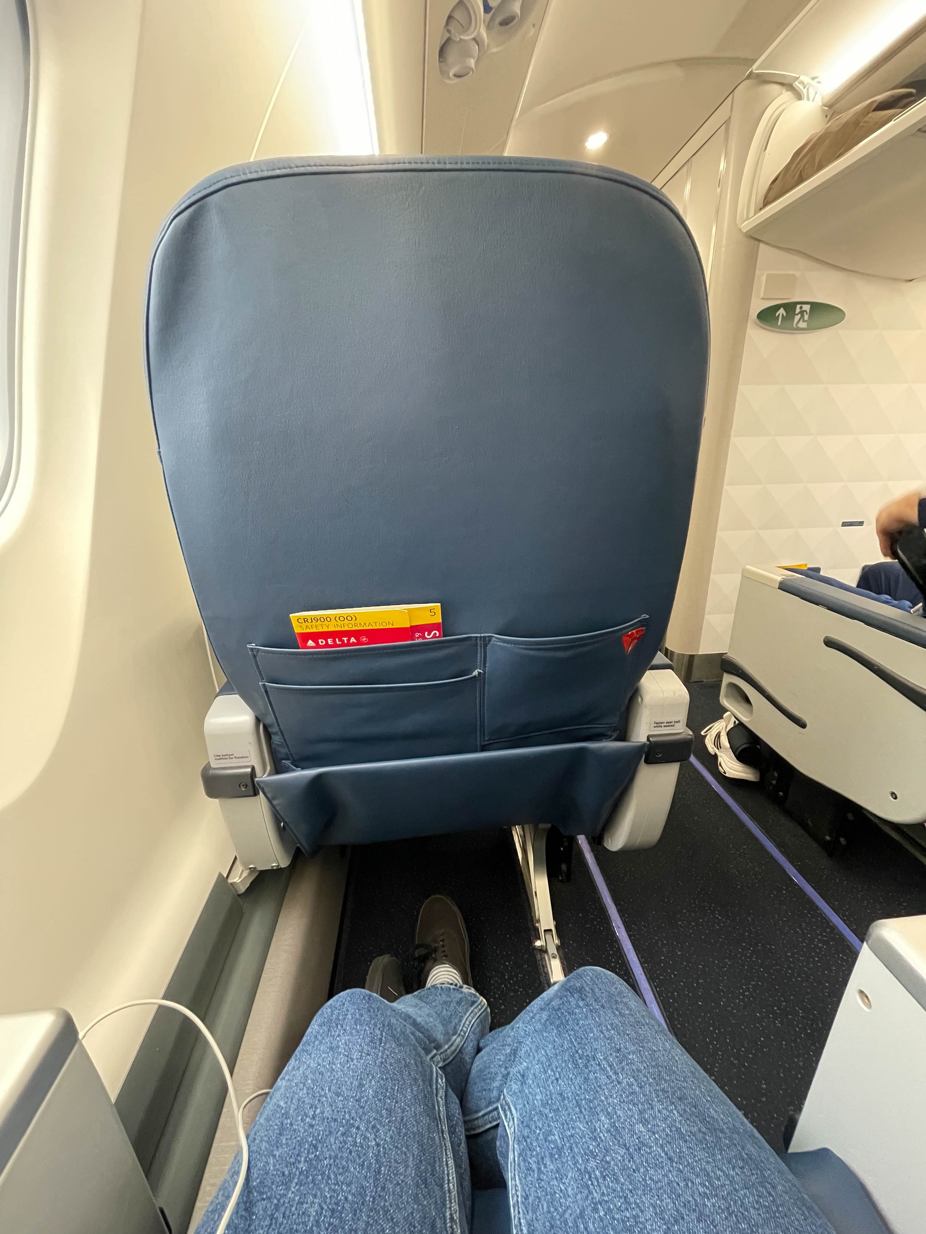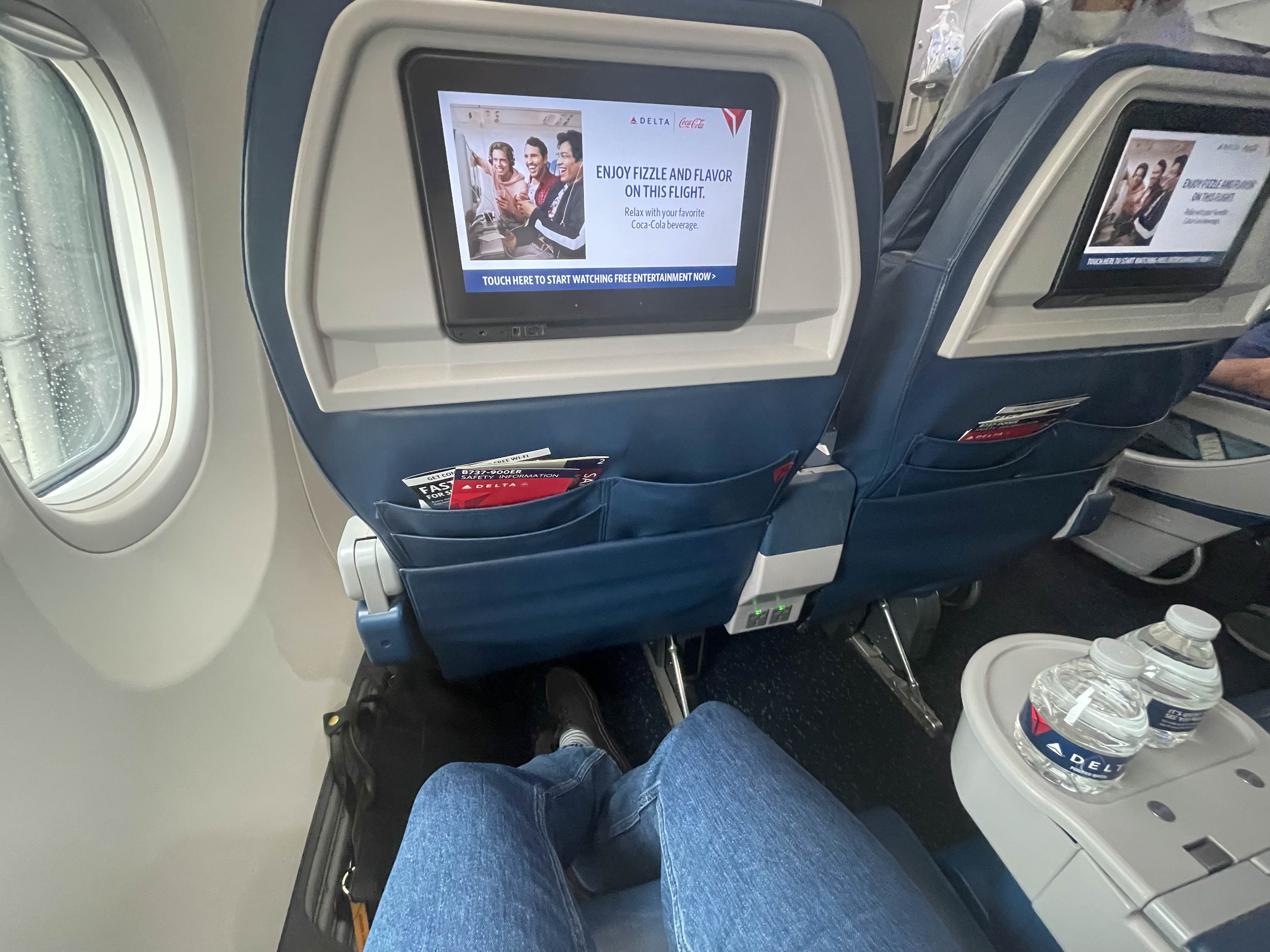Der er ikke lounge adgang når man flyver domestic First med mindre man har status hos Skyteam eller Delta - jeg har ingen af delene så jeg gik ud til gaten hvor jeg kunne se på fly og vente på det var tid til boarding. Vi kom om bord og afgang til tiden. Det boardes efter grupper og First er nummer tre efter passagerer som kræver assistance/små børn og militærfolk i tjeneste. På grund af mindre plads om bord skulle større kabinetasker tagges og afleveres ved boarding - man fik dem så tilbage ved gaten ved ankomst, præcist som SAS gør. Jeg tænkte at der måtte da være plads i First på grund af færre sæder - men der er kun overhead skabe i højre side af flyet i First - hvilket til gengæld giver en dejlig luftig følelse når man sidder på et A sæde. Sædet var godt syntes jeg, god plads og som man kunne ønske sig business class så ud også i Europa.