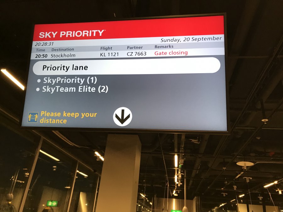 KLM Crown Lounge 52 efter lite strul med att komma in. Eftersom jag redan hade varit i loungen en gång tidigare idag fick de kontrollera manuellt. För personalens och passagerarnas säkerhet är det numera en plexiglasskiva mellan oss och kvinnan som skulle kontrollera mitt boardingpass fick absolut inte röra min mobil enligt de bestämmelser som hade tagits fram. Efter lite krångel lyste det grönt och jag hälsades välkommen. Hämtade väskan, tog ett glas vatten och laddade min telefon några minuter.