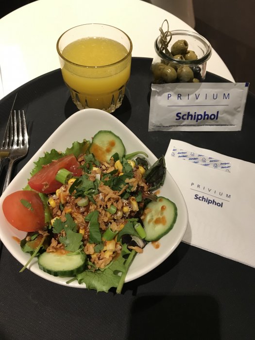 Privium loungen och hade fått en liten sallad, några oliver och ett glas apelsinjuice serverat på en bricka framför mig:
