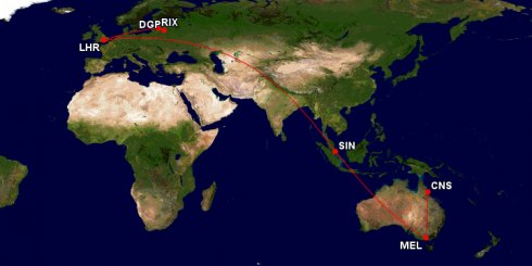 Efter mitt brölopp 2005, skulle vi på bröloppsresa. Resan gick då i ett svep enligt bilden nedan. Det är natruligtvis inte 1 flight, men ändå... Det tog många timmar att nå Cairns! Great Circle Mapper