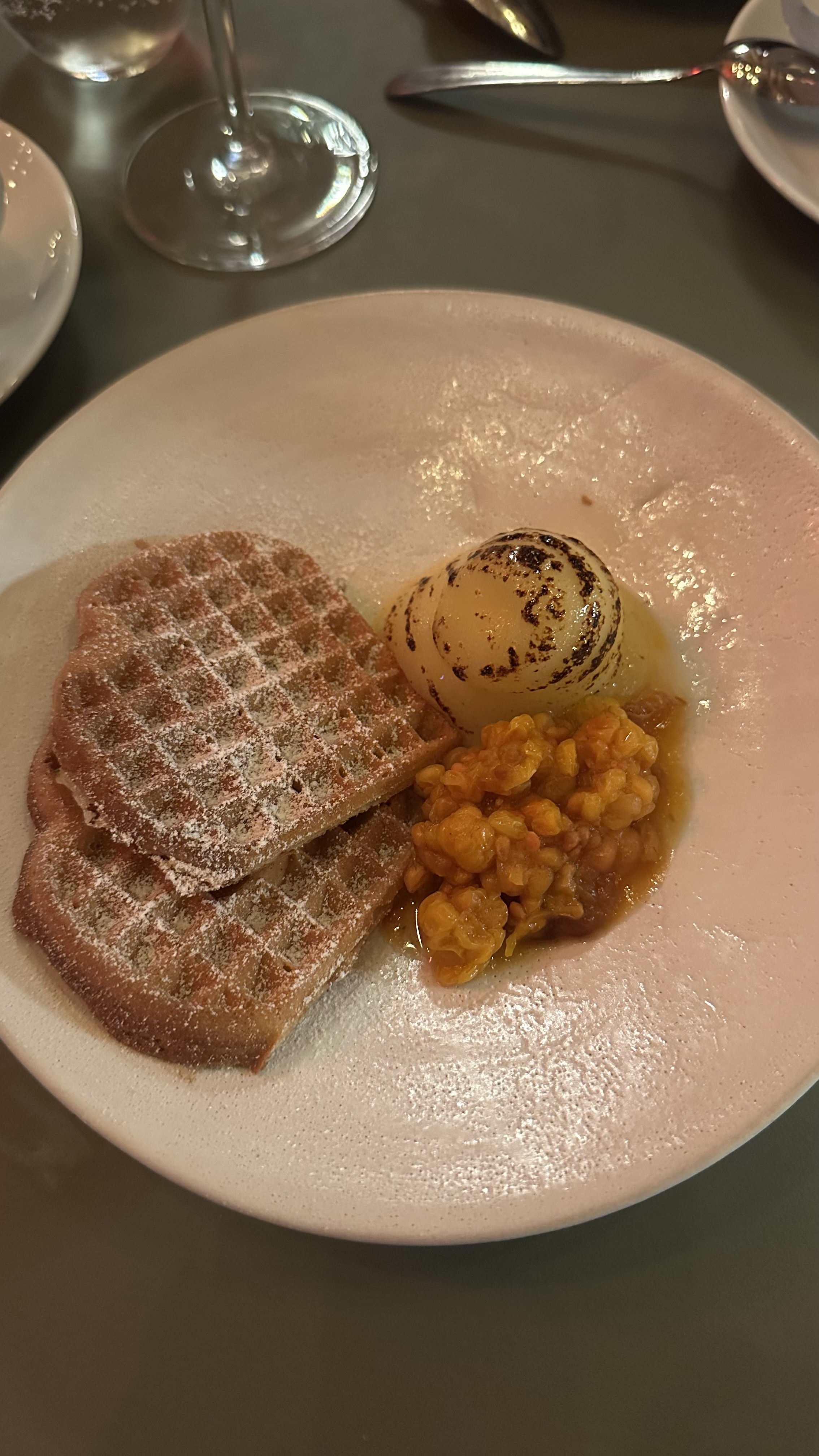 Avslutade med Våfflor med tallegio och hjotron och madeline, äpple, och glass.