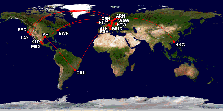 Vilka flygbolag har du flugit? Lufthansa (25), SAS (12), ANA (3), Cathay Pacific (2) och United (2).