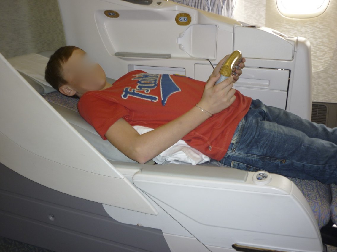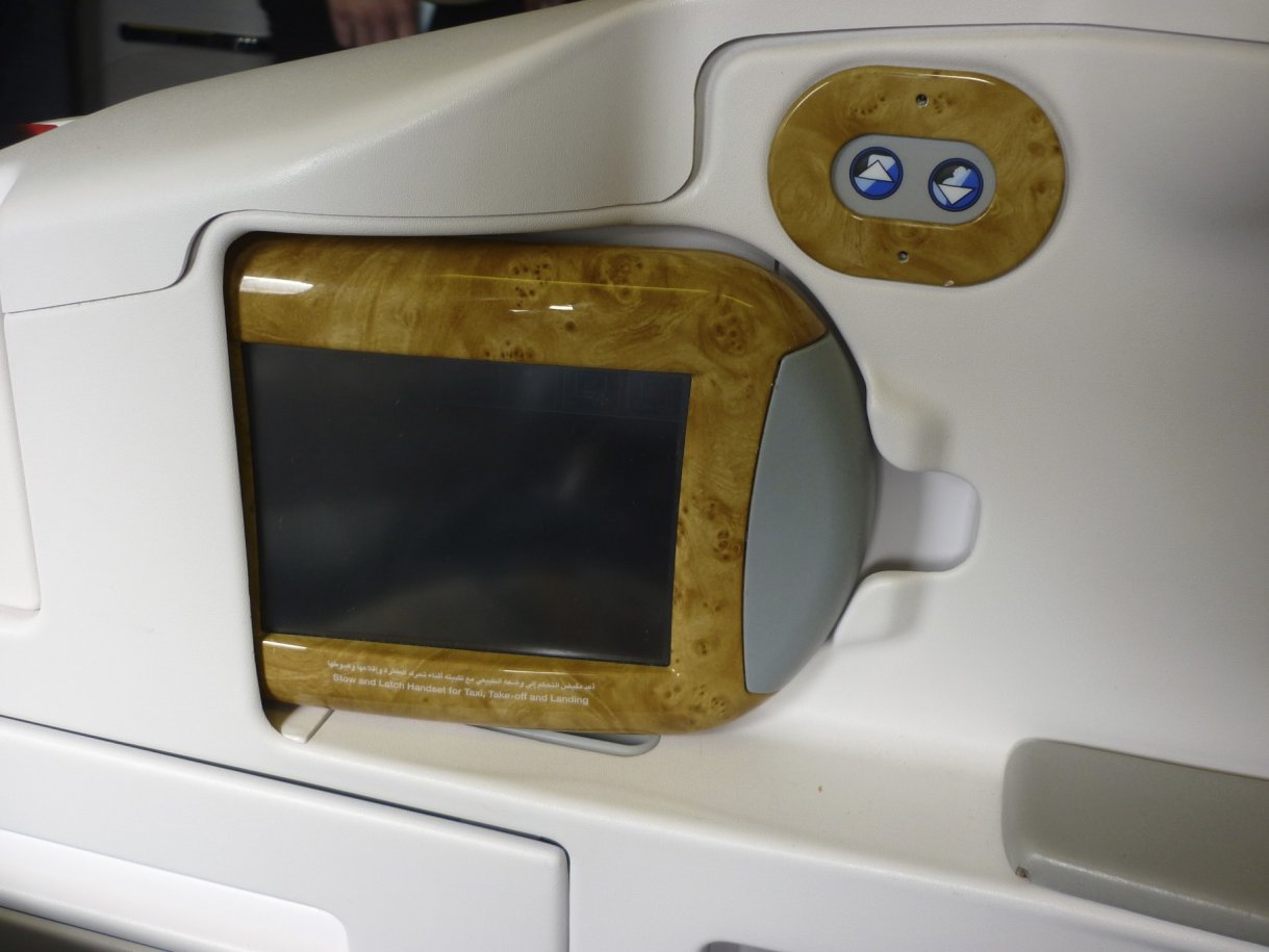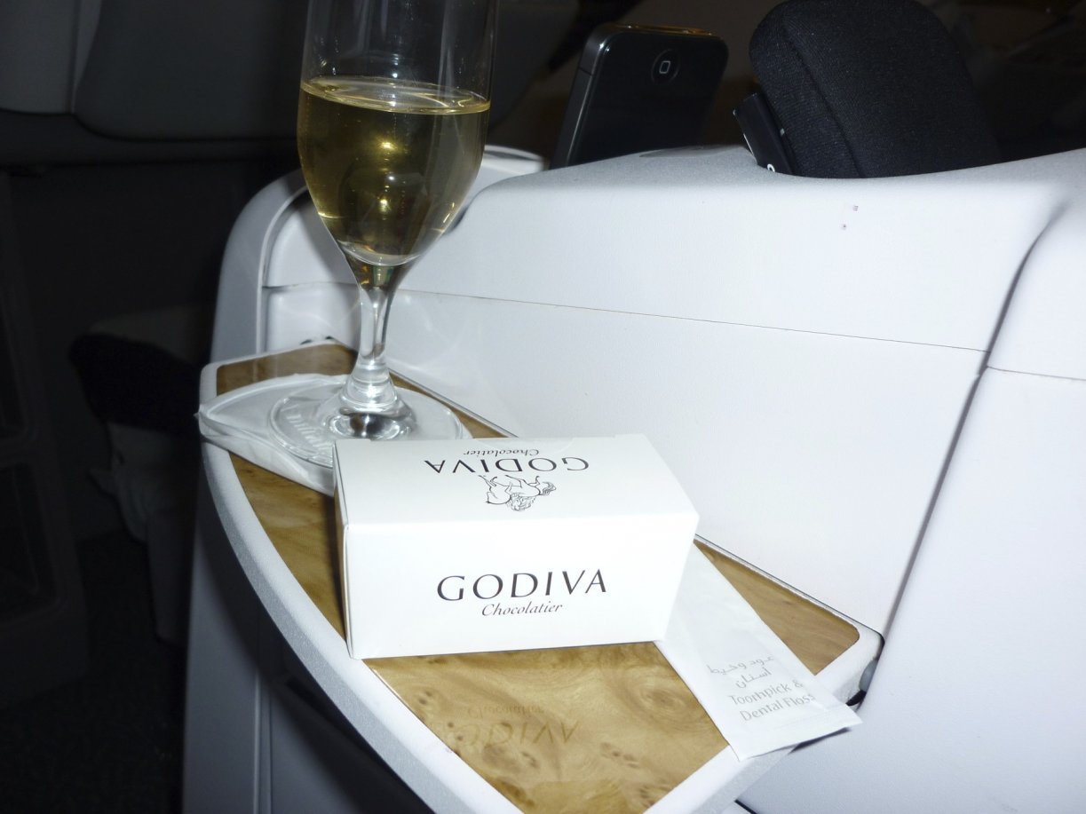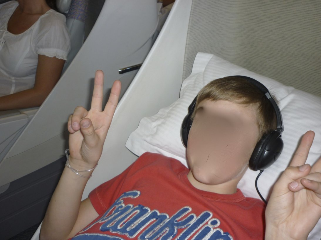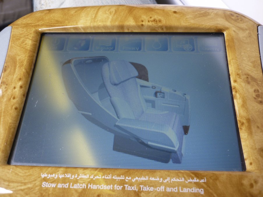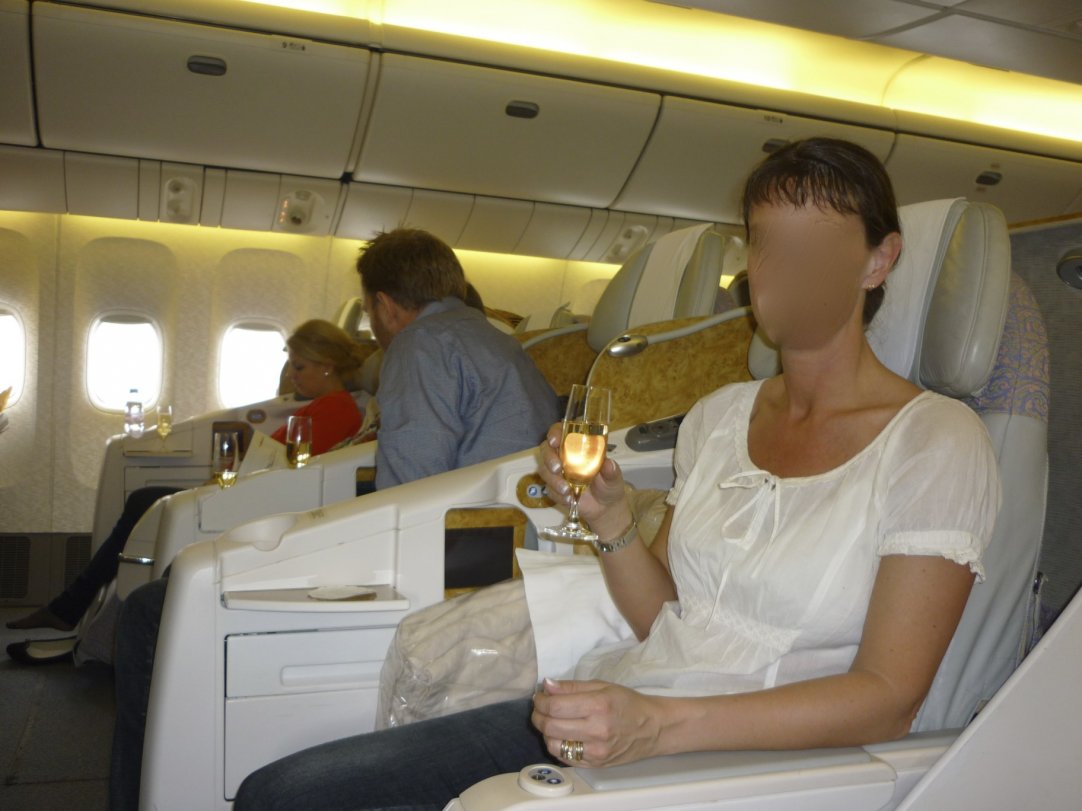 Nu till det viktigaste, det som vi alla sett fram emot sedan vi bokade. Emirates business class! Förväntningarna var skyhöga efter alla reportage, bilder och forum man lusläst sedan vi bokade 4 månader tidigare. Ombordstigningen gick väldigt smidigt och vi tillsammans med passagerare i first kunde i lugn & ro lägga undan vårt bagage och sätta oss tillrätta innan "de andra" där bak fick gå på. Nästan omedelbart så serverades champagne eller apelsin juice (Svårt val!) samt en varm handuk för att torka av dammet som economy passagerarna drog upp när de passerade oss på väg till sina minimala stolar längre bak!