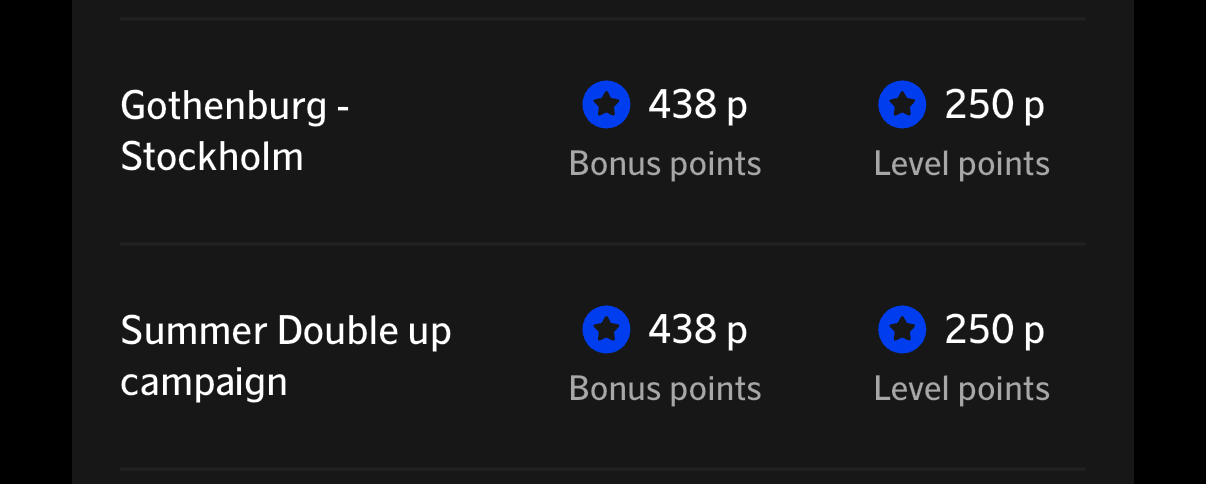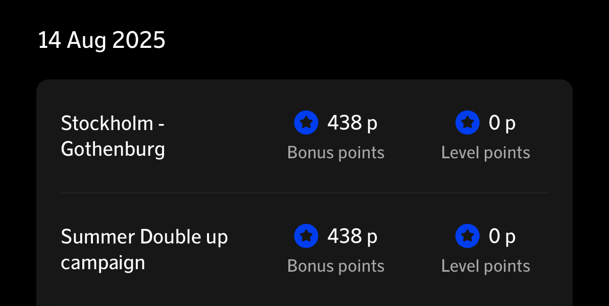 Jag tycker den här kampanjen är skitbra - fick 650 nivåpoäng och 375 bonuspoäng inbokat på kontot igår (yes, mer nivåpoäng än bonuspoäng). Problemet? Har inte gjort en inrikes revenue resa på år och dar och framförallt inte i sommar, bokade dock en bonusresa VBY - ARN åt sonen i juli så antar att det är den som spökar… Men poäng på poängresa är ju bra