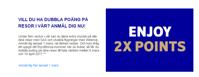 Under fem veckor i vår kan du tjäna extra mycket på alla dina resor med SAS och utvalda flygningar med Wideroe. Anmäl dig senast 1 mars, via länken nedan. Och kom ihåg att uppge ditt EuroBonus-nummer när du bokar, så får du dubbla poäng på dina resor till hela världen mellan 6 mars och 10 april 2017.**