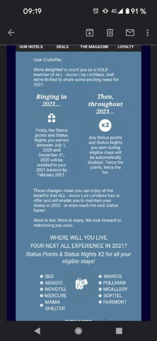 Blev lite ledsen när jag kikade min mailkorg när du skrev detta, men 1,5h senare dök det upp i min inkorg att jag som silver även fick detta också, kanske man äntligen kan bli guld hos Accor!Fick detta mejl nyss. Detta gör att det i praktiken bara krävs 15 nätter under 2021 för att behålla guldstatus till 2022.Visa bifogad bild 115621