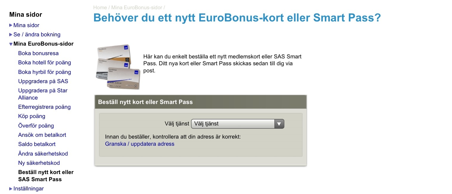 Du kan beställa nytt kort själv när du är inloggad i Eurobonus, gå till Mina Sidor.