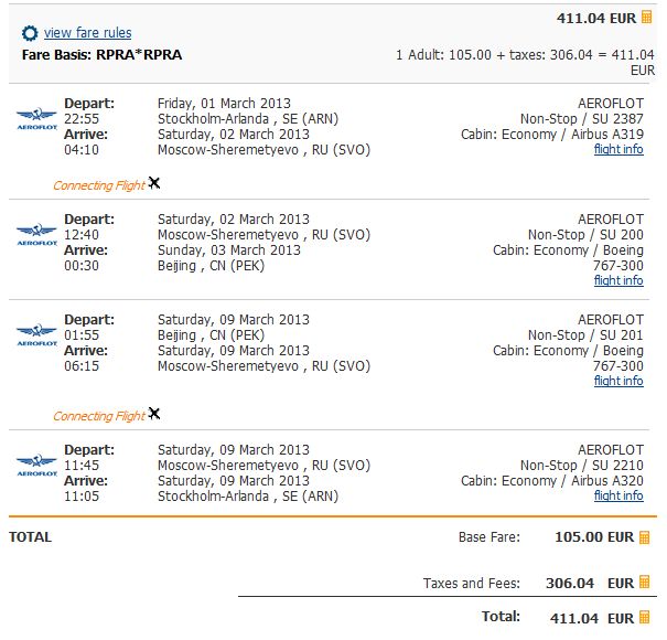 [Economy class] Stockholm/København-Beijing/Shanghai T/R, Aeroflot, 3.620 SEK inkl. skatter