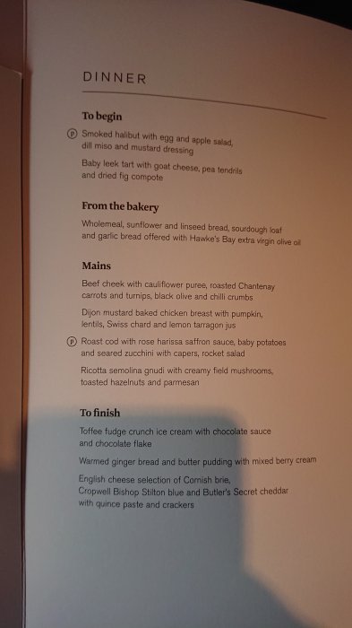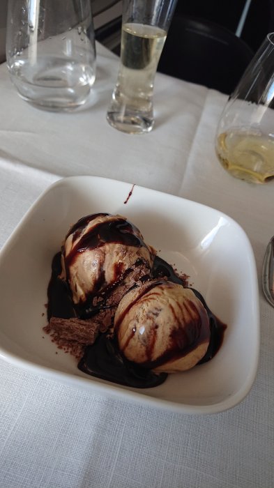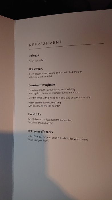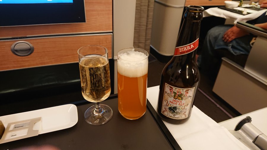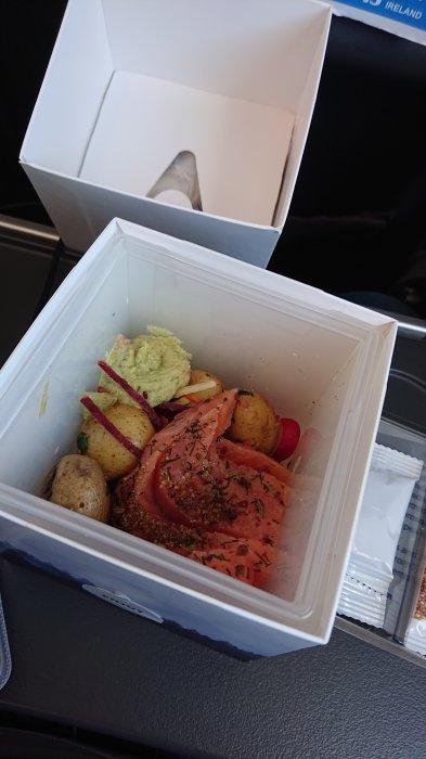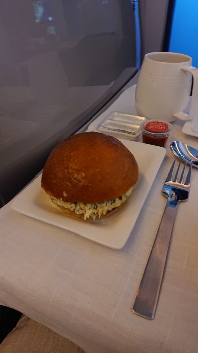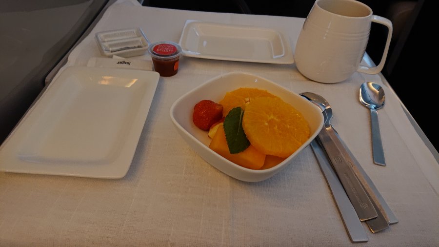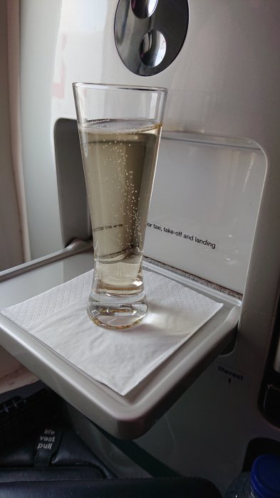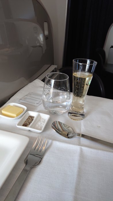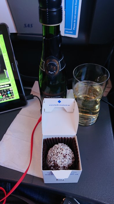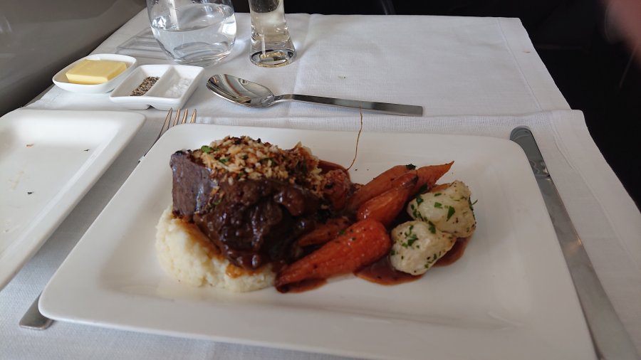 Sammantaget så var det en bra matservering. En bra bit över medel för affärsklassmat, men inget exceptionellt. Helt OK viner. Tog inget foto på vinlistan, men har för mig att det var tre vita och tre röda, och inga problem att smaka flera av dem. Lite snålt med påfyllning i glasen under serveringen. All servering sker från vagn, och tallrikarna ställs ner direkt på bordsduken.