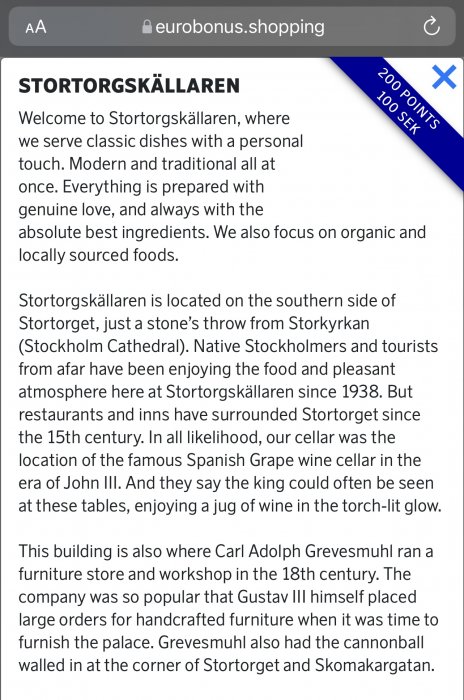 Hur är då Stortorgskällaren kanske ni undrar? Tyvärr kan jag meddela att det enda positiva är just dom generösa poängen man erhåller. Menyn är trist och den Entrecote jag beställde var orimligt medioker till det priset. Men 4.400 poäng på en 2.200 kr nota är faktiskt också orimligt mycket. Så synd att klaga.