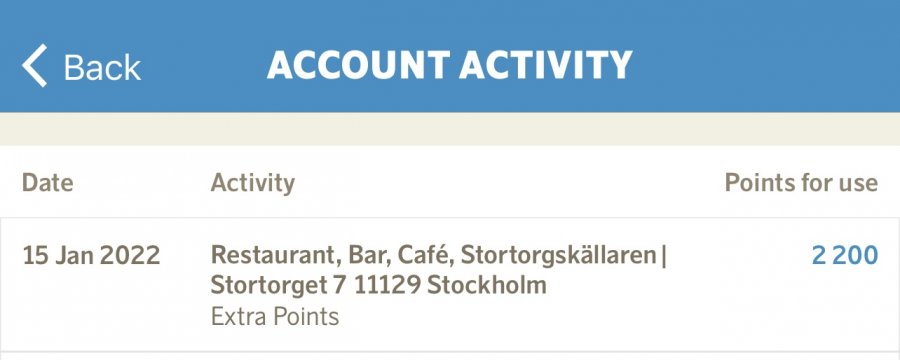Jag har positiva erfarenheter att efterregistrera poäng från restaurangbesök trots att jag inte hade notan/kvittot kvar. Jag bifogade en printscreen av AMEX transaktionen (utvidgat läge) från mitt junibesök på Stortorgskällaren. Några dagar senare rasslade det till och 4.400 poäng trillade in på kontot. Ni som har koll vet ju att man får fina 200 poäng per 100 sek på "Källaren". Så mycket skönt att reglerna runt efterregistreringen inte är benhård.
