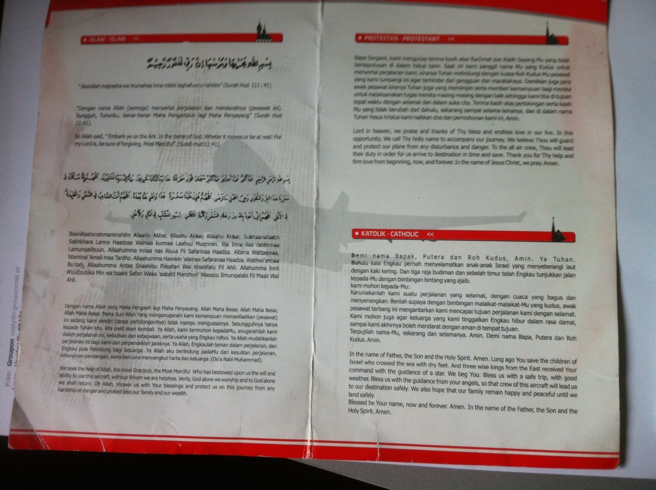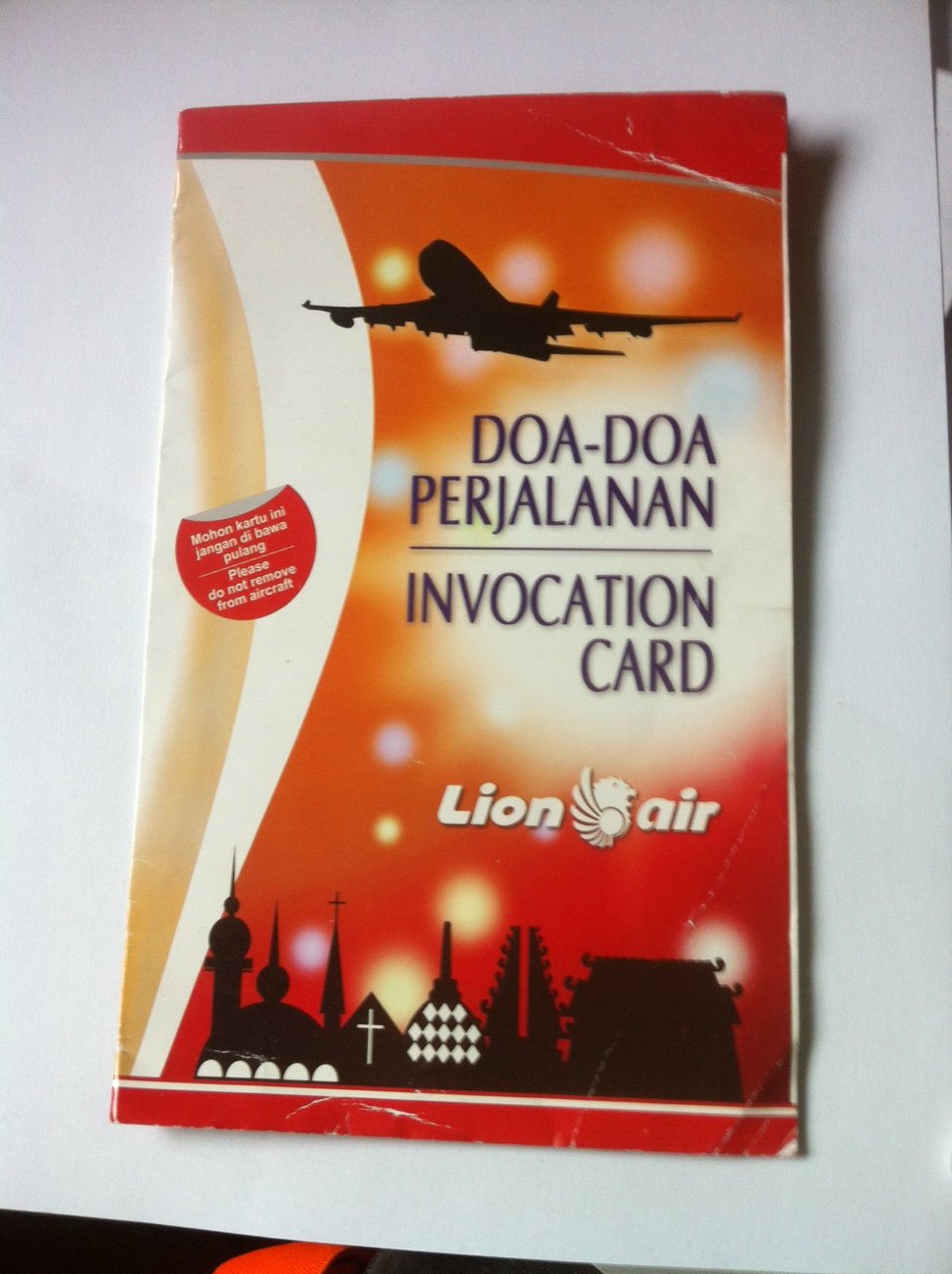 Under denna sommar/höst har vi flugit en del med Lionair i indonesien. Det har i huvudsak fungerat bra trots deras lite dåliga rykte. I lionairgruppen ingår flera andra flygbolag, Batikair, Wings air m.fl. I stolsfickorna hittar man utöver de vanliga säkerhetsbladen m.m. även ett "INVOCATIONS CARD". Detta visade sig innehålla förböner inför flygningen för både muslimer, protestanter, katoliker och hinduer!