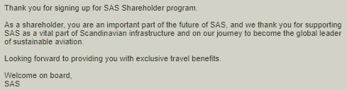 Please note: The SAS AB Nordic register is updated monthly. If you are a new shareholder, please contact us again Mid-November 2020. This will enable us to send you an activation code to the SAS AB Nordic Investor Portal, which can be used to create a username and a password.
