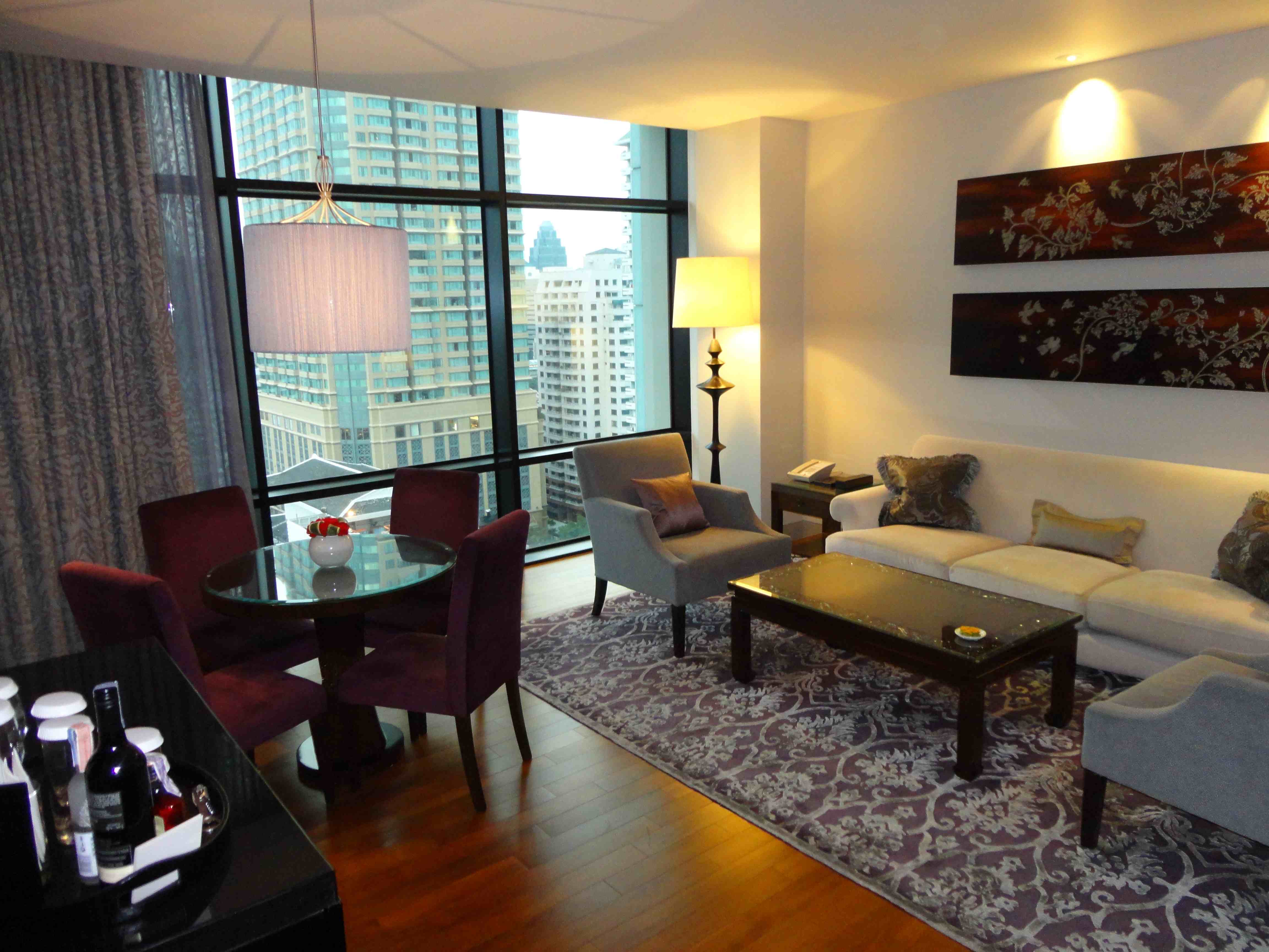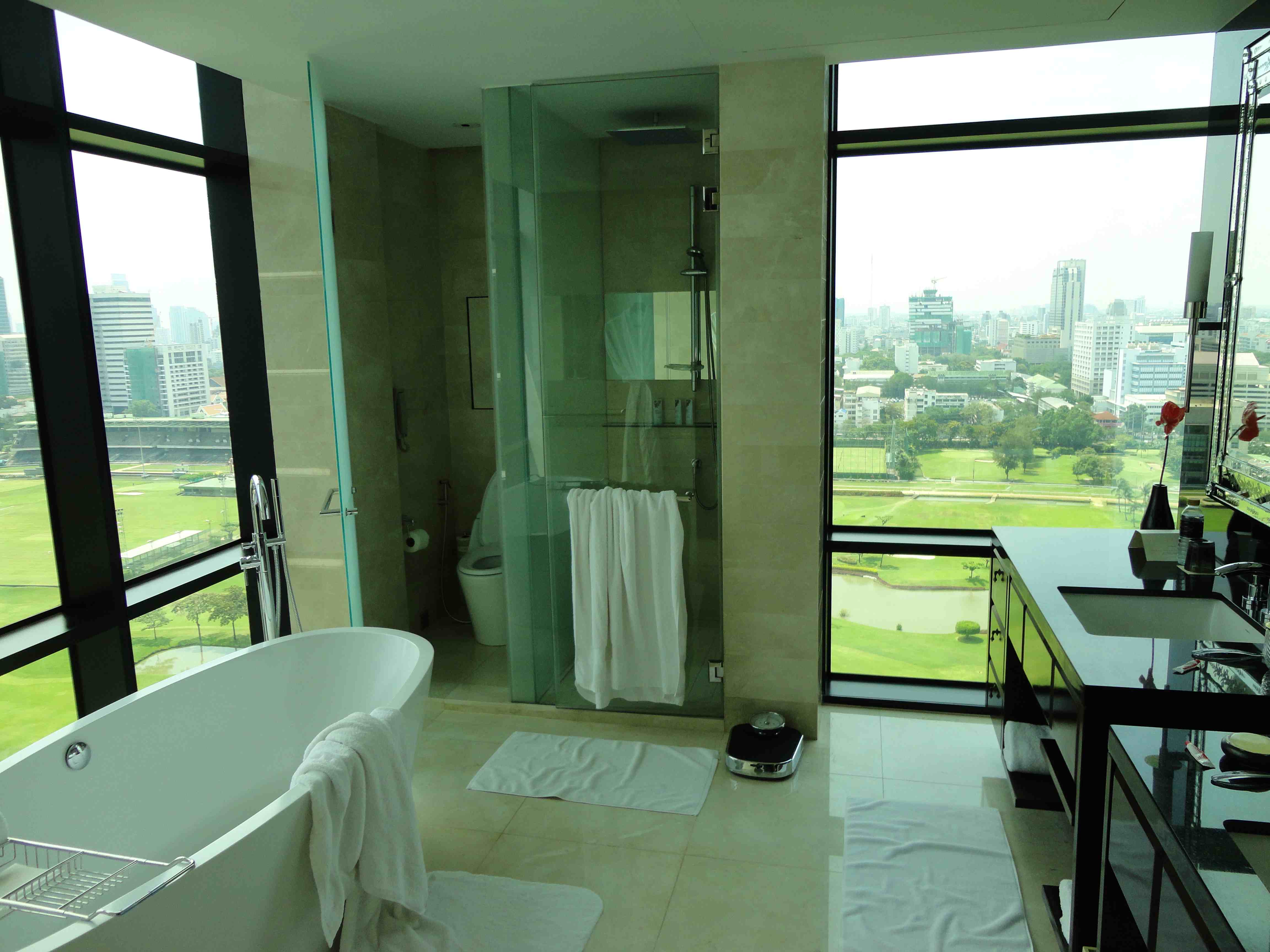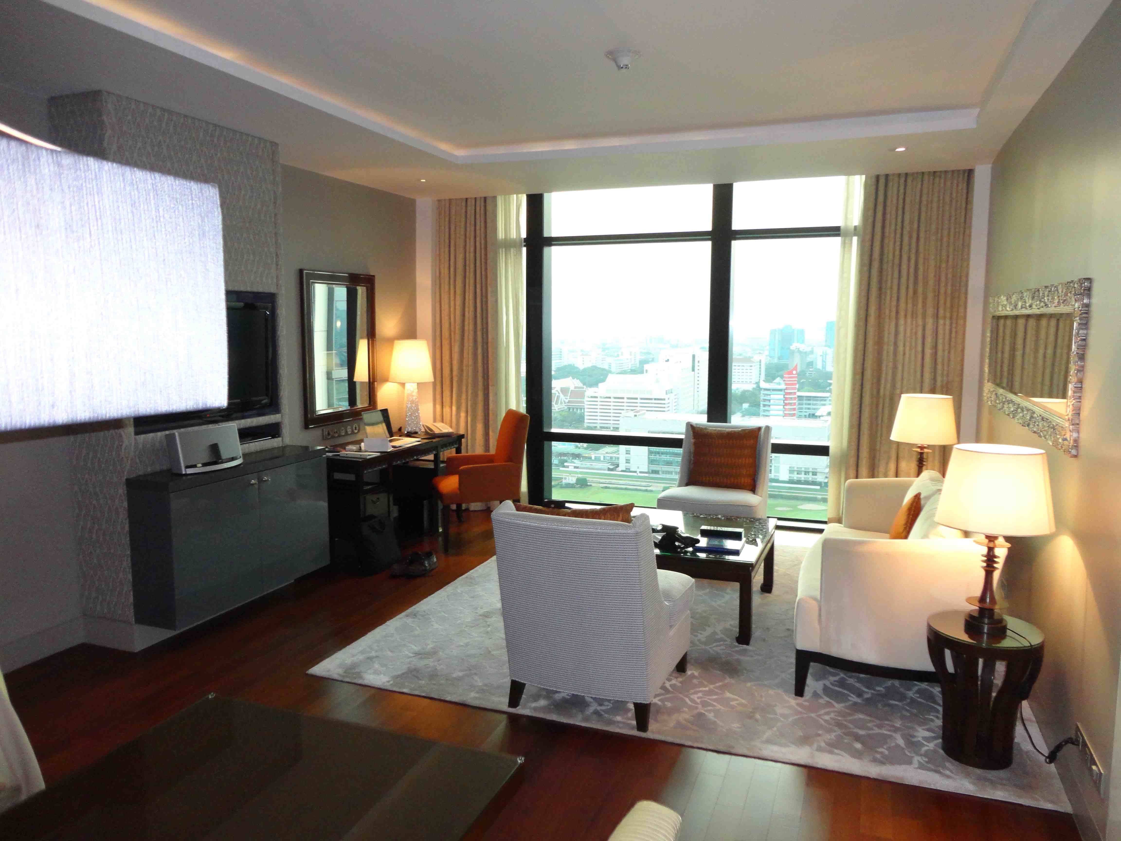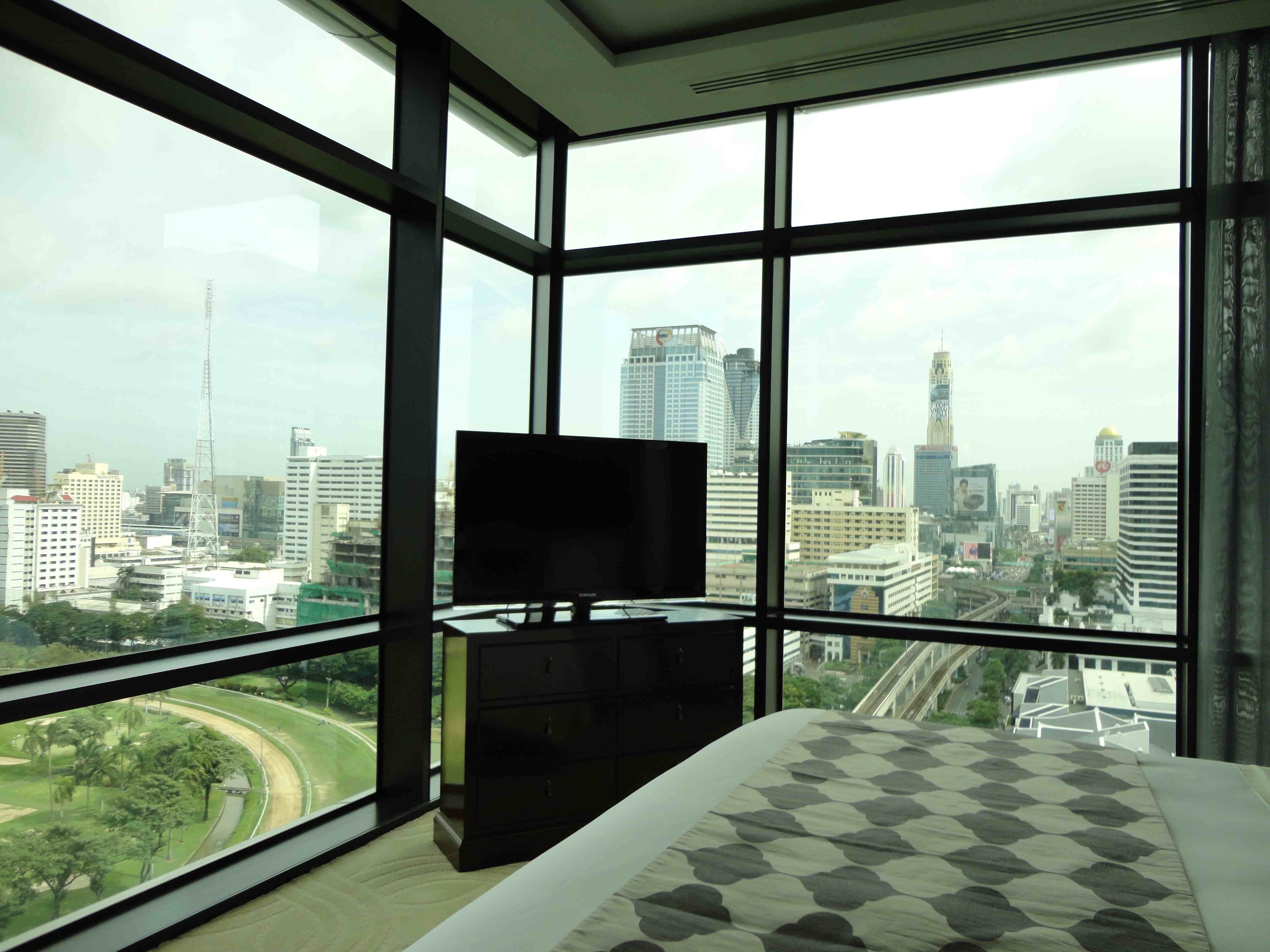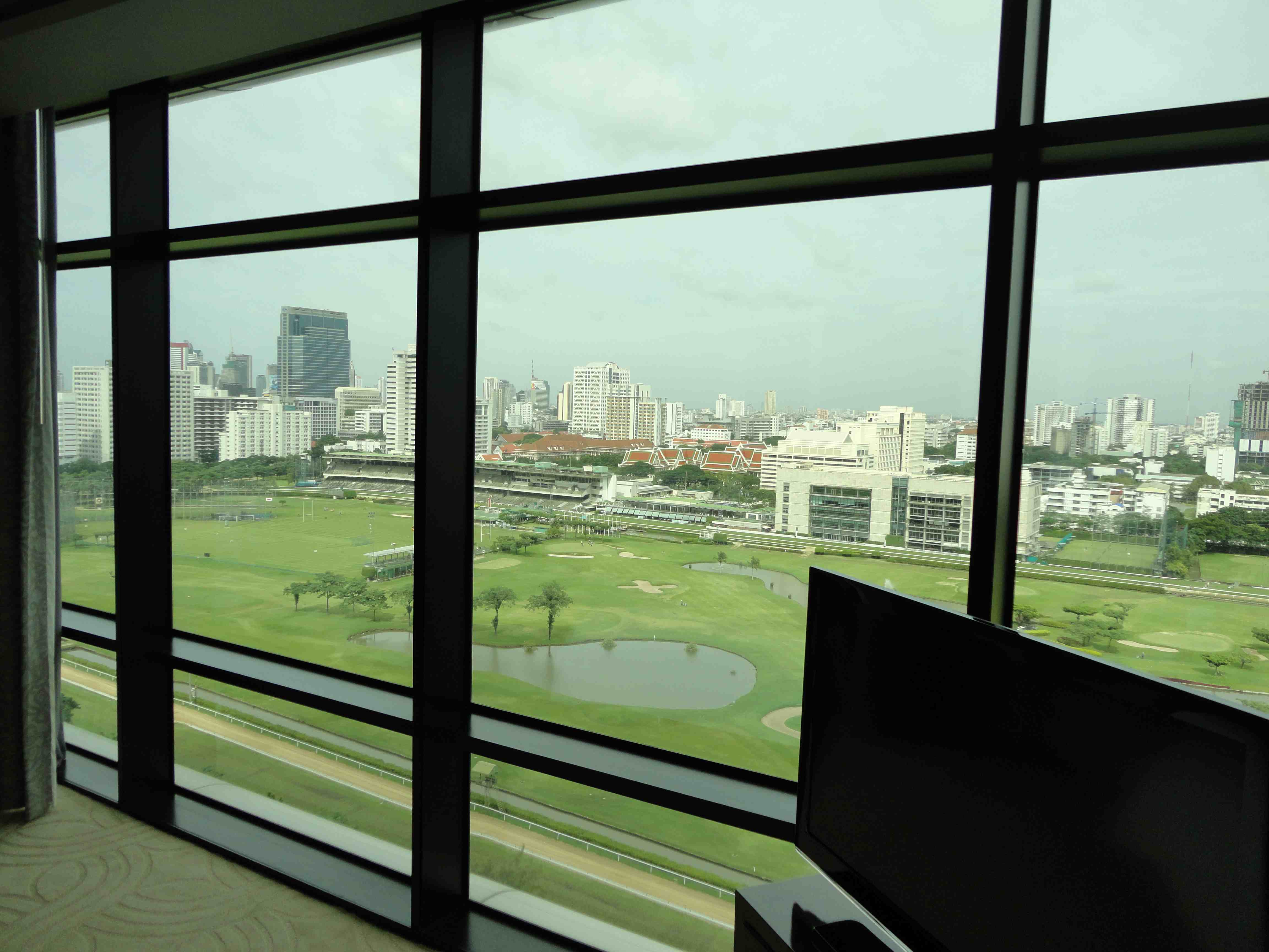 St Regis BKK har mkt fina sviter med utsikt över stadens hästkapplöpningsbana. Sov- och badrummen has en spektakulär utsikt. På söndagar är det rätt så trevligt att se kapplöpningarna ”live” från fönstret. Jag har bifogat några bilder som visar utsikten från dessa rum (tagna i år). På det hela taget är St. Regis f.n. en av prestigeadresserna i Bangkok, och hotellet är mycket populärt bland Bangkokbefolkningen för fester och sammankomster. Den italienska restaurangen på bottenvåningen är en av Bangkoks bästa.