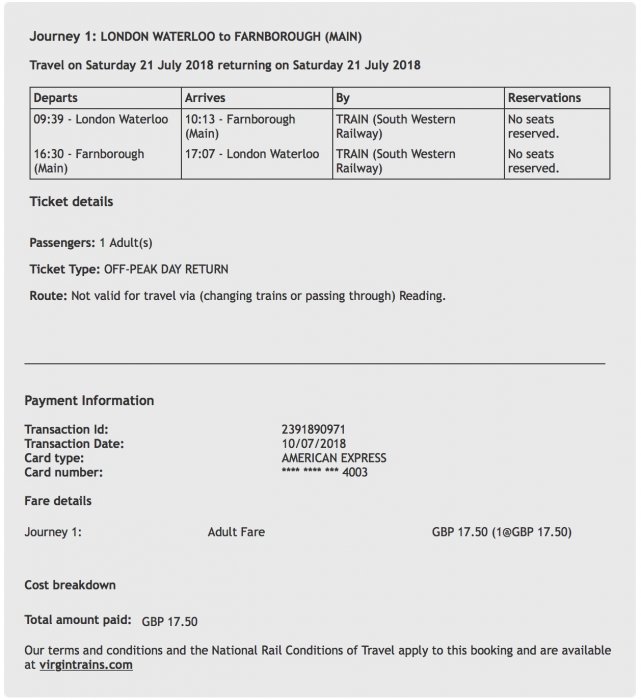 Kollade och såg att åka in till Waterloo och sedan Farnborough skulle ta 2.5-3 timmar och bil går troligen på runt 40 minuter