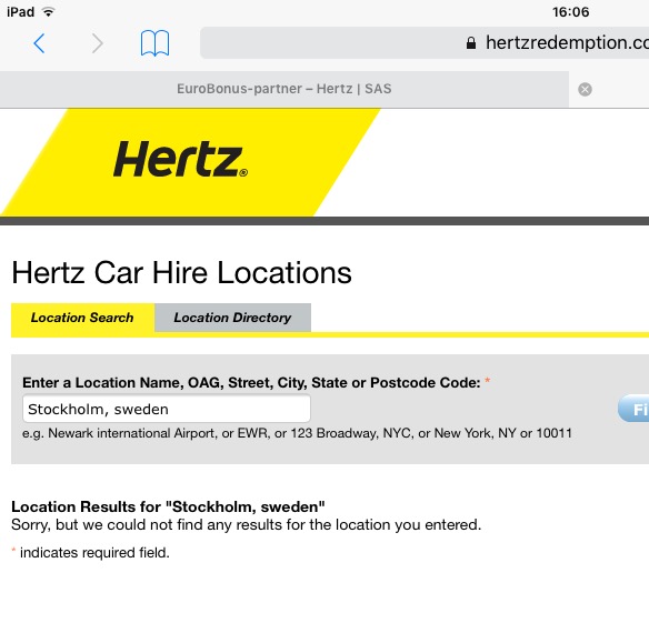 Loggar in hos EB och kommer till Hertz där jag försöker hitta någon ställe att hyra en bil från Hertz.