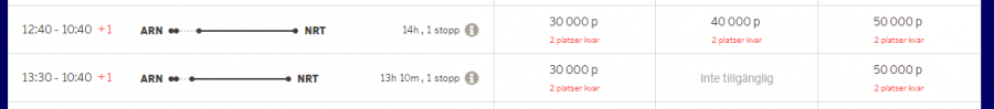 Det är alltså en sökning av bonusresa ARN-CPH-NRT, där det uppenbarligen finns platser i både Plus och Business på CPH-NRT. Däremot går det bara att boka Business på den ena anslutningen från ARN, och inte Plus. Hur kan det bli så, den delen av resan är ju Plus för båda klasserna?