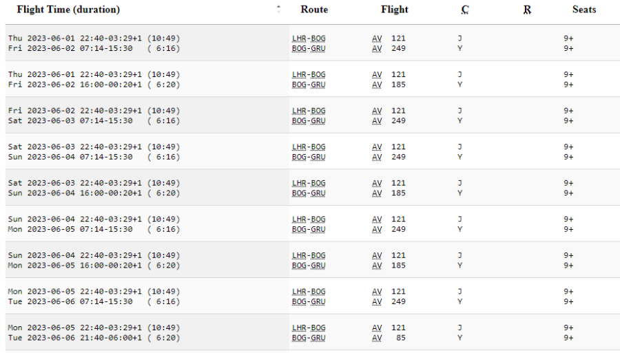 Problemet med Avianca och SAS sökmotor är att de resor som finns inte syns pga att det är blandade kabinklasser. Avianca har inte business inom Sydamerika längre utan bara på longhaul. Därför blir benet BOG-GIG alltid i ekonomy, vilket gör att det inte dyker upp i SAS *A-sökning. Leta istället upp datum där du hittar platser på varje strecka för dig tex ARN-LHR-BOG-GIG och ring sen in. Behöver dock vara ca 11 månader innan avresa för att det ska finnas gott om platser.