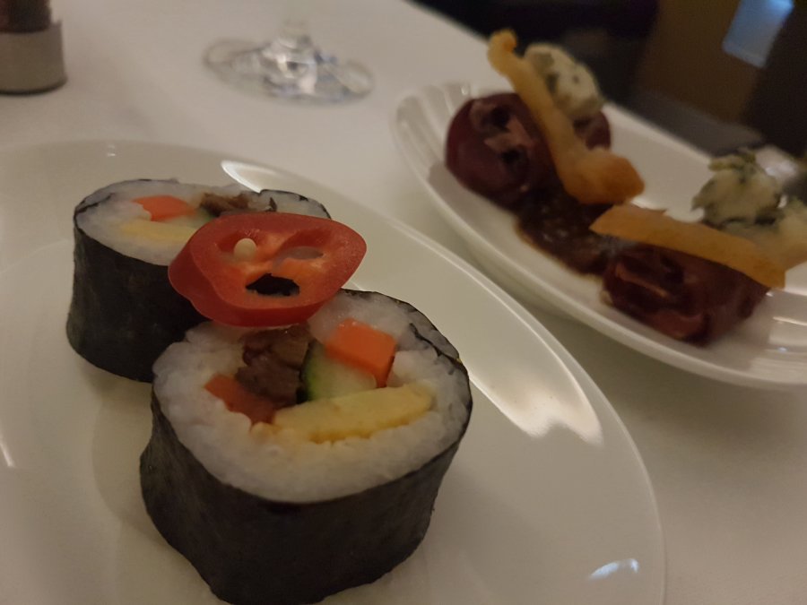 Väl på plats 2A blev jag ganska omgående erbjuden en välkomstdrink och jag valde förstås champagne. Hade hoppats på Laurent Perrier Grand Siècle, som dom hade sist, men jag fick ”nöja mig” med Henriot. Det gick ner det också ;)