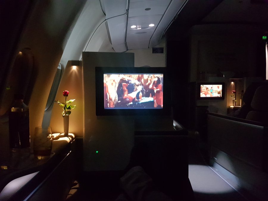Efter att ha klivit in i planet, från bryggan (?) som ledde till F-kabinen, tog jag snabbt till vänster efter att ha hälsat på kabinpersonalen. Så gjorde man ju på 747-8i… Det gjorde man inte här. Jag höll på att hamna i cockpit och något förvirrad vände jag och gick åt höger istället. Möttes av glada skratt från CC som frågade om det var jag som skulle köra ;)