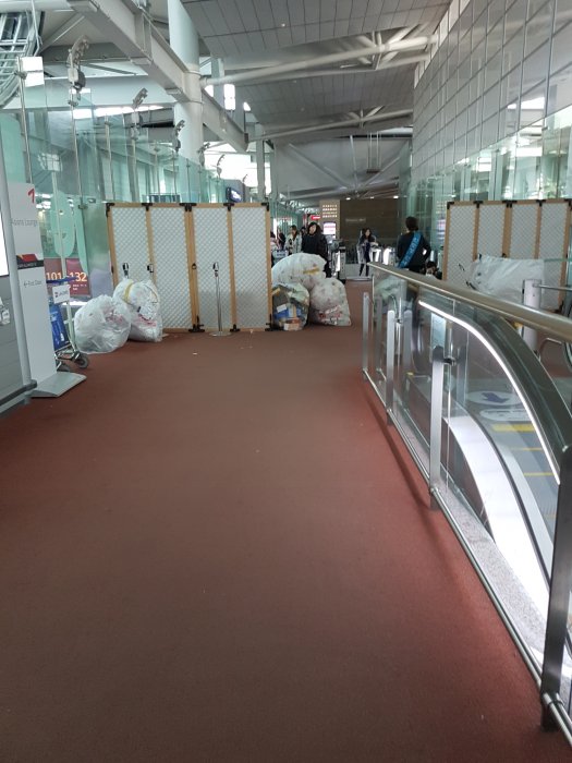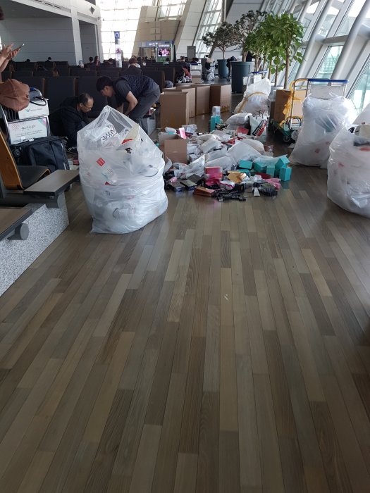 En sak som jag inte riktigt förstod mig på var att på olika ställen på airside, satt det upp till 20 personer på golvet, med stora säckar med olika varor. Det såg ut att vara allt från parfymer till elektronikprylar. Dessa säckar tömde dom på golvet och sorterade enligt något system. Bredvid gick en man eller kvinna med stora säckar där dom samlade ihop skräpet som blev.