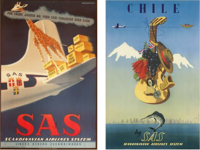 Jag har tre original(SAS) affischer från 50-60-talet som sitter inramade på väggen här hemma. Sedan har jag även 7 st stora affischer(tavlor) från tidigt 90-tal som hängt på SAS HQ. Tre av dem får sitta uppe eftersom även tjejen tycker de är snygga