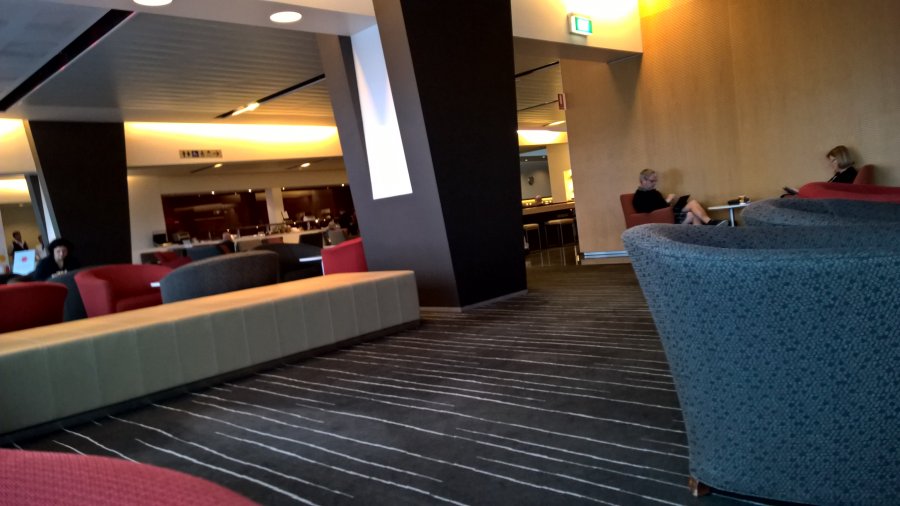 En förvånansvärt fräsch lounge! Gigantiskt stort men väl ljuddämpat och inrett. Då det var morgon, serverades en full frukost av både kallt och varmt. Möjligheten att göra egna pannkakor samt paninis var riktigt bra!