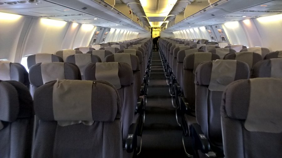 Business sektionen. 2+2 säten och urtrista färger! Varför ha ett vitt plan med stänk av röda Kängurur för att sedan inreda hela kabinen i smutsgrått? Dirty Grey och mörkblåa sätesstöd som ser snodda ut från SAS eco divison mmmmmmm.