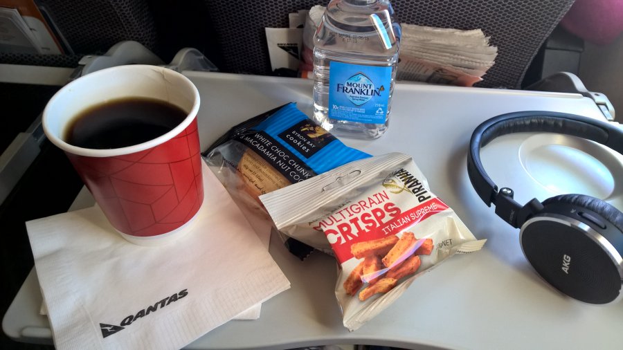 Väl uppe i luften tog det ett tag innan servering påbörjades. Misstänker att Business serverades först och sedan Eco. Inget att hurra för, QF slår givetvis SAS och serverar fri dryck samt enklare snacks. Denna dag bestående av chips samt en horribelt översockrad cookie.