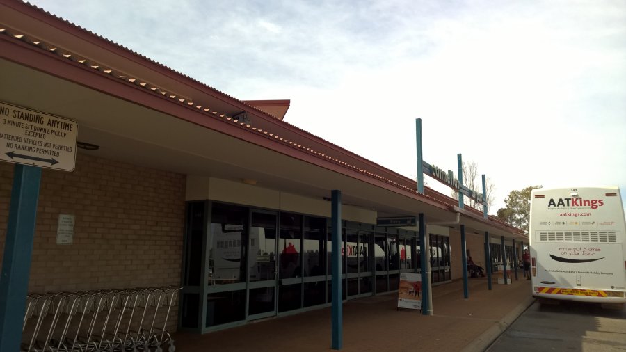 Touchdown och snabbt in i den minimala Terminalen av Alice Springs som tillhanda håller ett par gater samt två bagageband. Hyrbilsfirmorna ligger inne i terminalen nås direkt från bagagebanden.