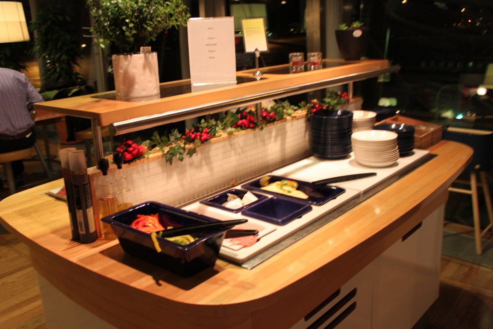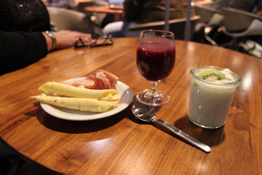 Lampan lyste grönt och vi kom in i lugnet. Det var en del folk här, men det var lätt att hitta en sittplats vid fönstren. Utbudet var lite kallskuret, bröd, sallad och diverse drycker. Fixade en lagom frukost som sköljdes ner med en cappuccino.