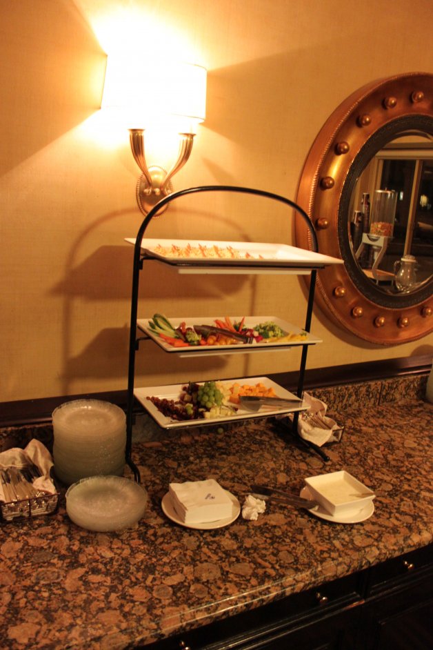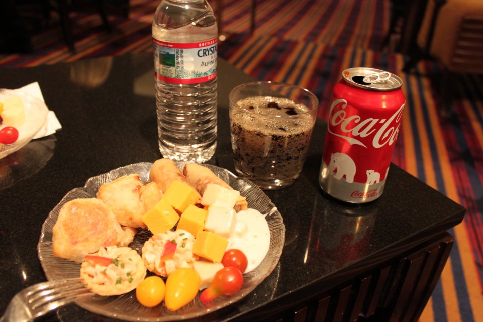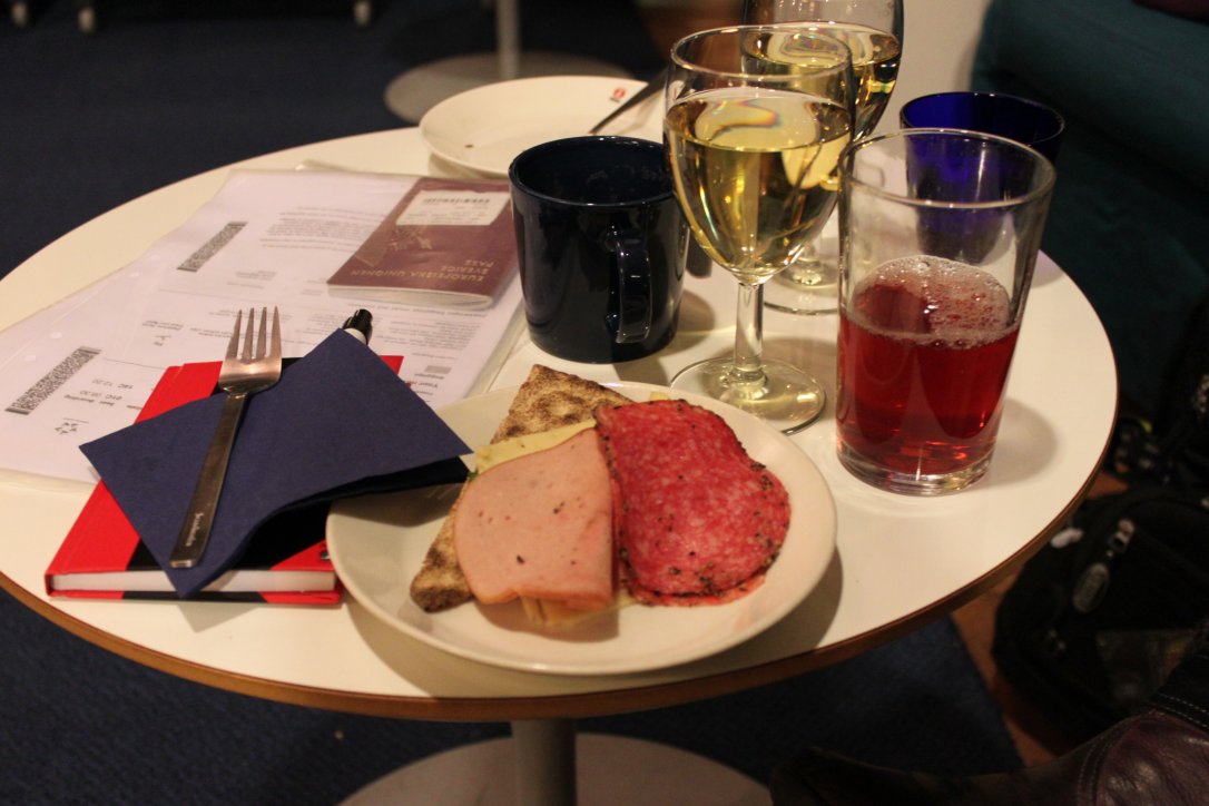 På buffén erbjöds varmkorvar, fruktsallad, yoghurt, mackor och snacks. Till det fanns 2 sorters vitt, 2 sorters rött, mousserande samt 4 sorters öl.