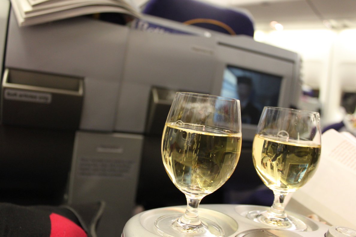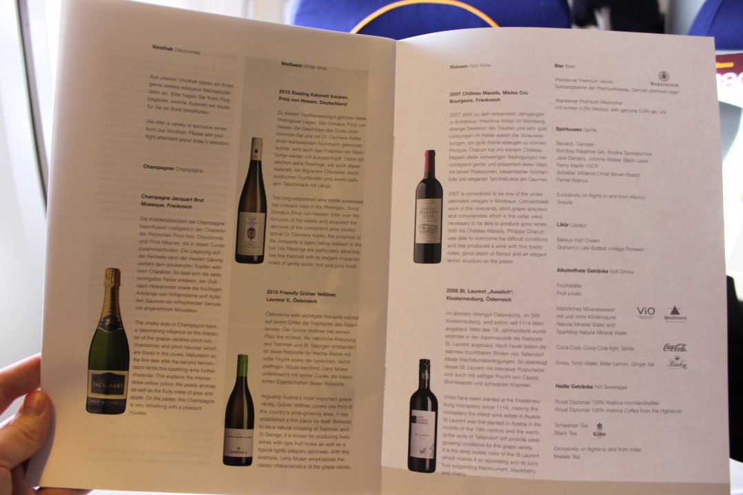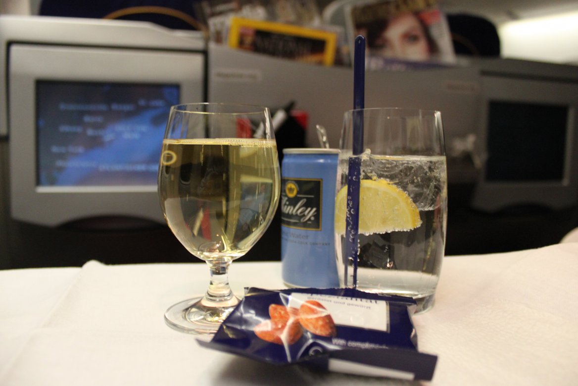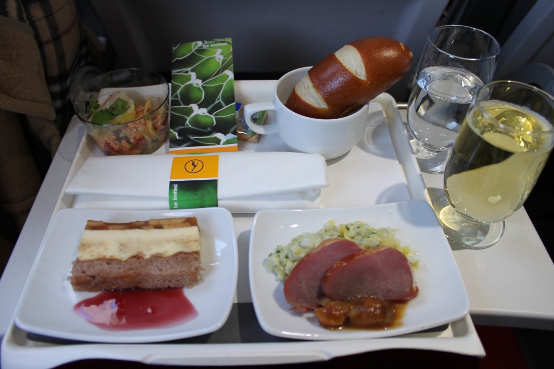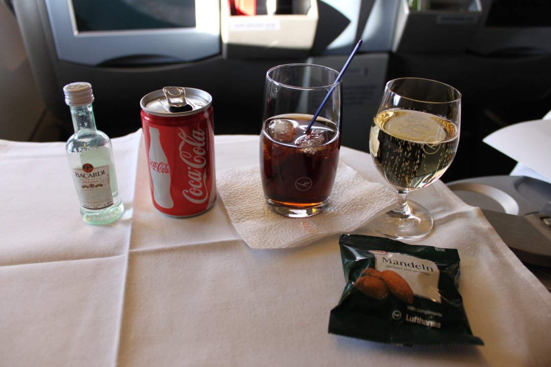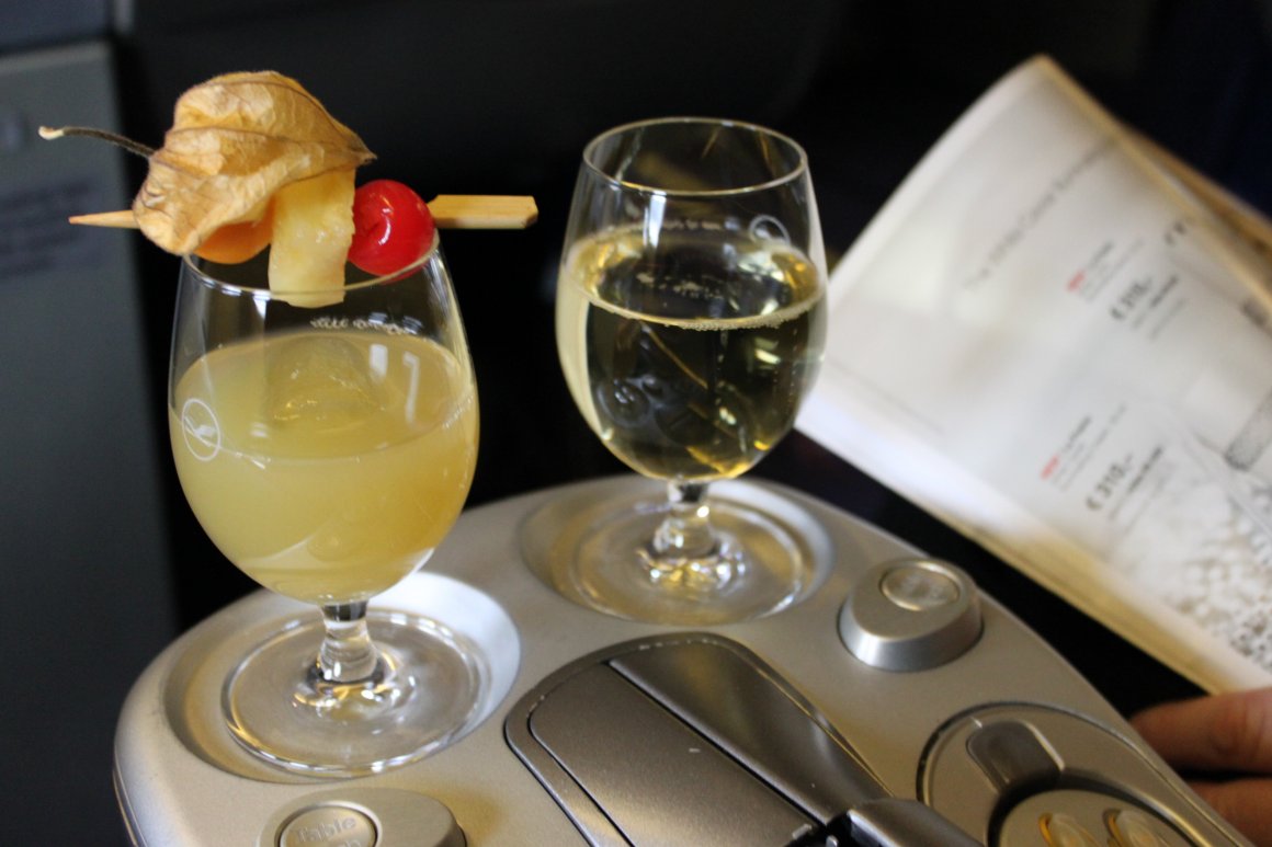 Kapten Hans Schulze hälsade oss välkomna ombord tillsammans med purser Tanja och berättade att flygtiden beräknades till 6h 50 min. Besättning kändes osynkad och det dröjde länge innan vi fick vår pre-departure drink. Valet stod mellan vatten, apelsinjuice och mousserande. Det blev mousserande, men tyvärr hade vi bara någon minut på oss att dricka upp det innan glasen samlades in.