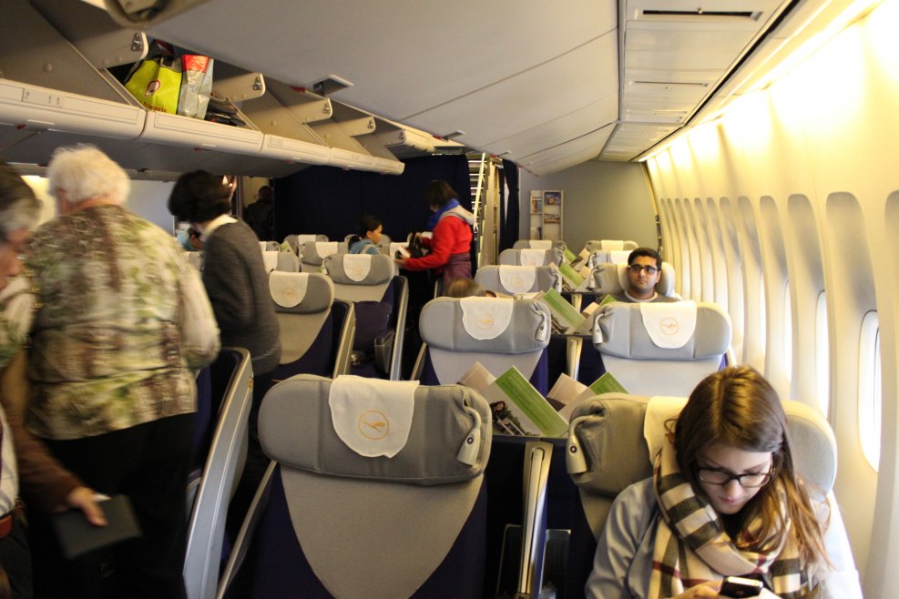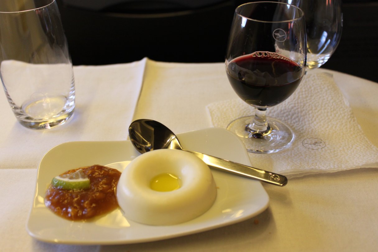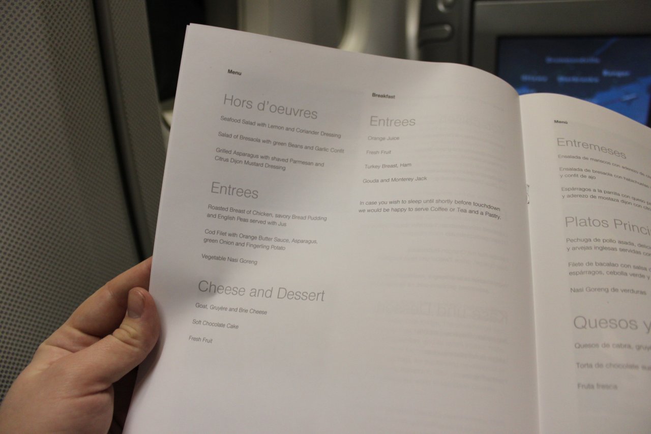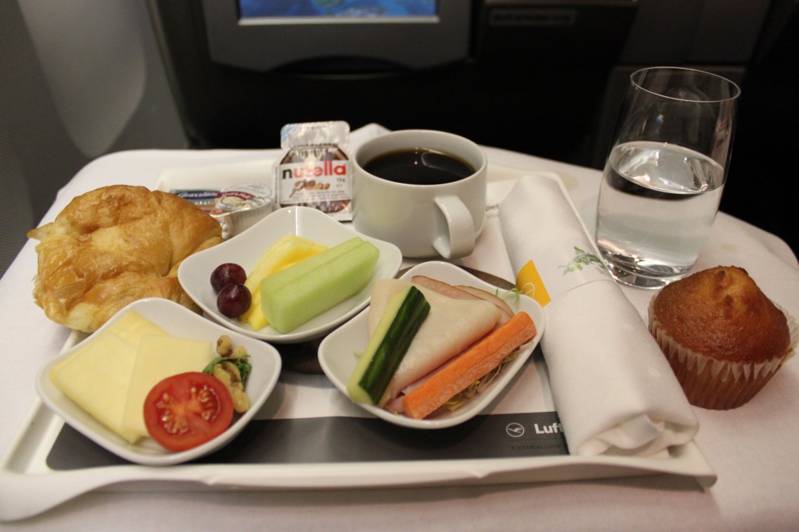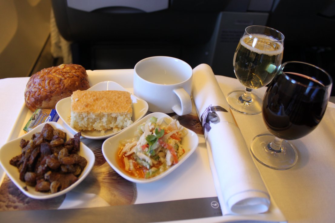 Kapten Hans Schulze hälsade oss välkomna ombord tillsammans med purser Tanja och berättade att flygtiden beräknades till 6h 50 min. Besättning kändes osynkad och det dröjde länge innan vi fick vår pre-departure drink. Valet stod mellan vatten, apelsinjuice och mousserande. Det blev mousserande, men tyvärr hade vi bara någon minut på oss att dricka upp det innan glasen samlades in.