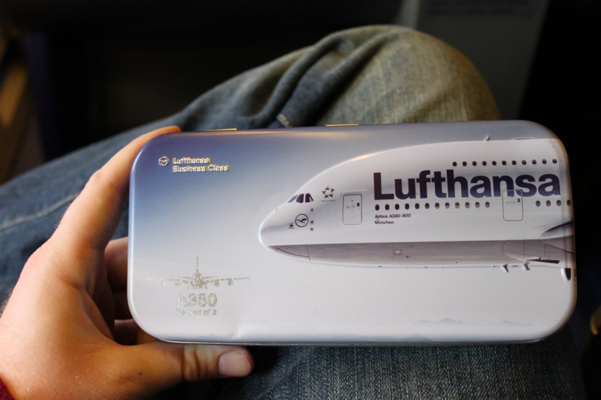 Kabinen kändes väldigt luftig, men den var mörk på grund av stolarna. Fotade på febrilt innan en grinig flygvärdinna kom och sa till mig något på tyska... På stolen låg en kudde och en filt. I armstödet fanns ett läckert amnetykit i en metallbox med en A380 på.