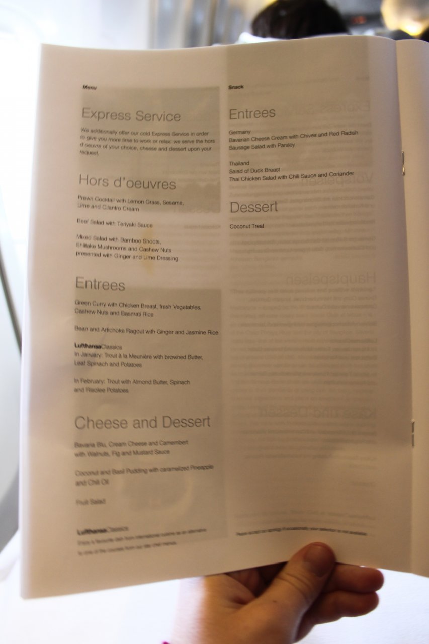 Vi lyfte runt 14 och strax där efter delades menyerna ut. Lufthansas menyer i Business class var gjorda av Thomas & Mathias Sühring som jobbar på Scirocco i Bangkok. Ett ställe jag var på för mindre än två veckor sedan! Tog bara en drink på Scirocco, men nu fick jag även smaka dess mat.