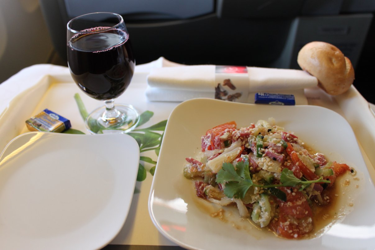 Efter några timmar var det tid för lite mellanmål. Det fanns ett val mellan thailändsk och tysk tallrik. Valde den thailändska och fick då Salad of Duck Breast samt Thai chicken salad with chili sauce and coriander. Som efterrätt en coconut treat. Det blev ett glas champagne till det samt en St Laurent Ausstich 2008 rött vin. Det var gott!