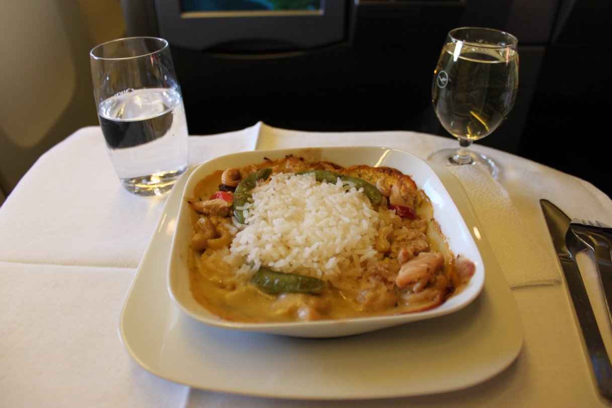 Inför huvudrätten plockades brickan bort och ersattes av en ny. Huvudrätten blev Green Curry with Chicken Breast, fresh vegetables, cashew nuts and Basmati rice. Dracks med en Riesling. Både maten och vinet smakade mycket fint.