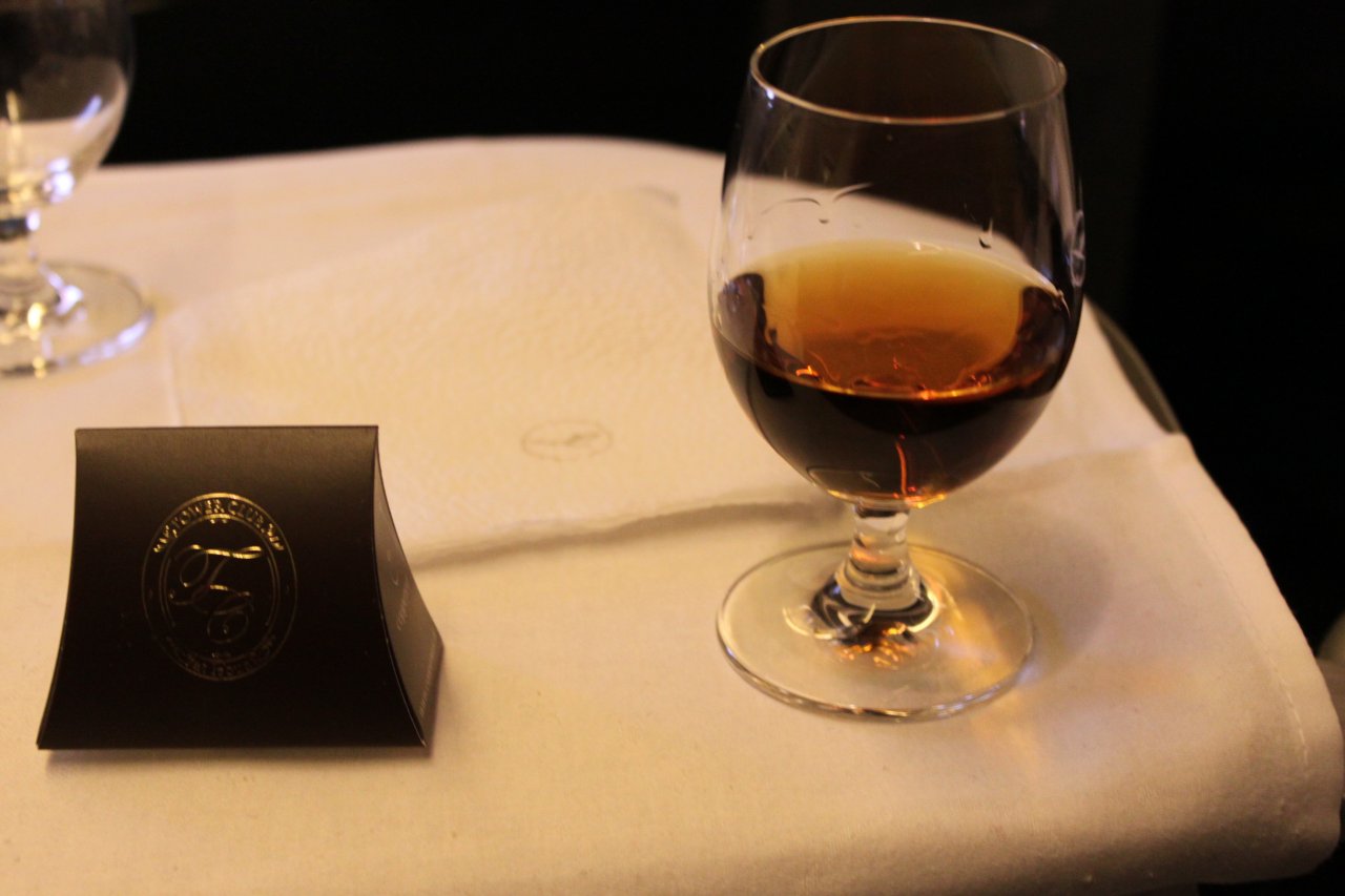 Efterrätten blev en Coconut and Basil Pudding with caramelized pineapple and chili oil. Låter udda, men gott var det! Drack portvin till det. Till kaffet blev det en Remy Martin VSOP och praliner från State Tower i Bangkok.