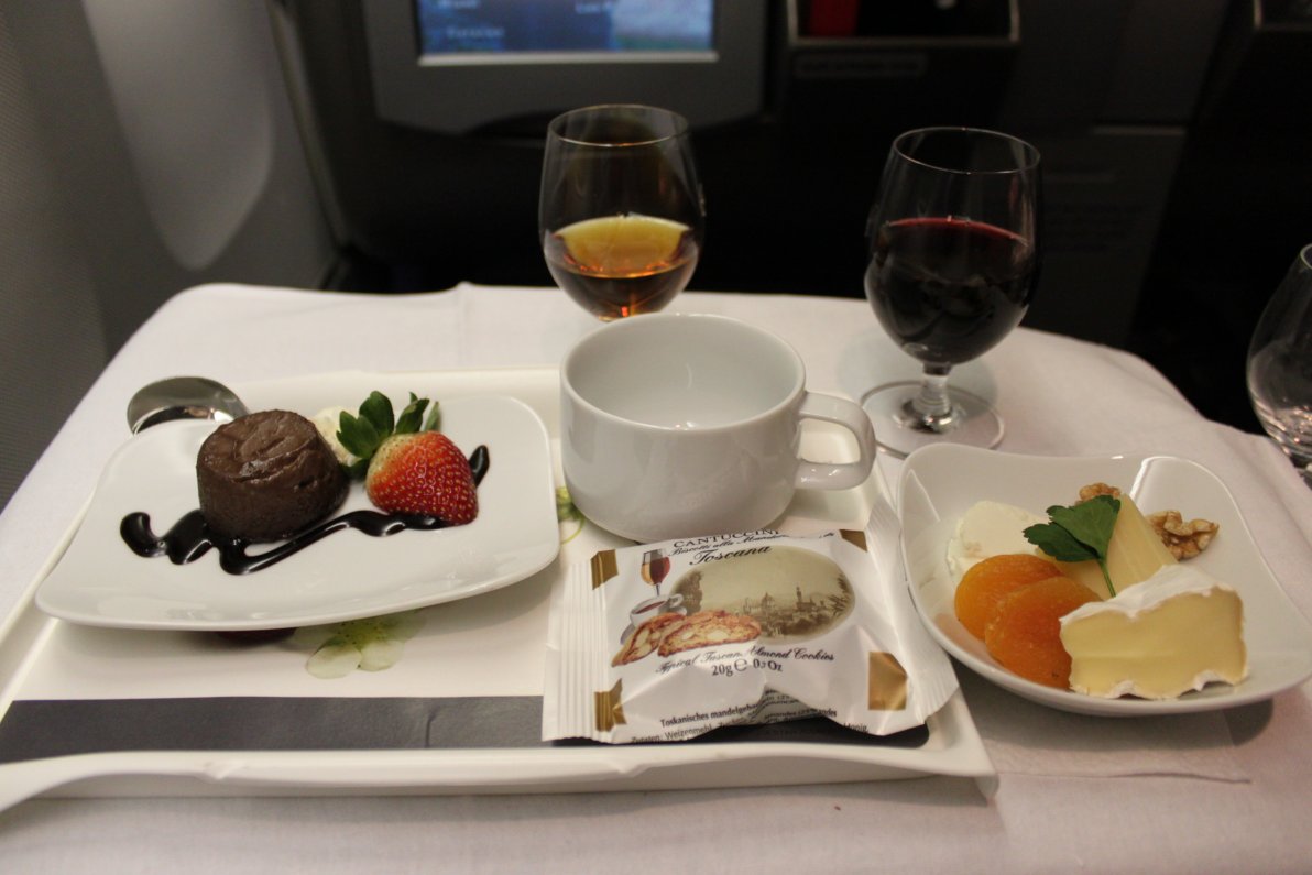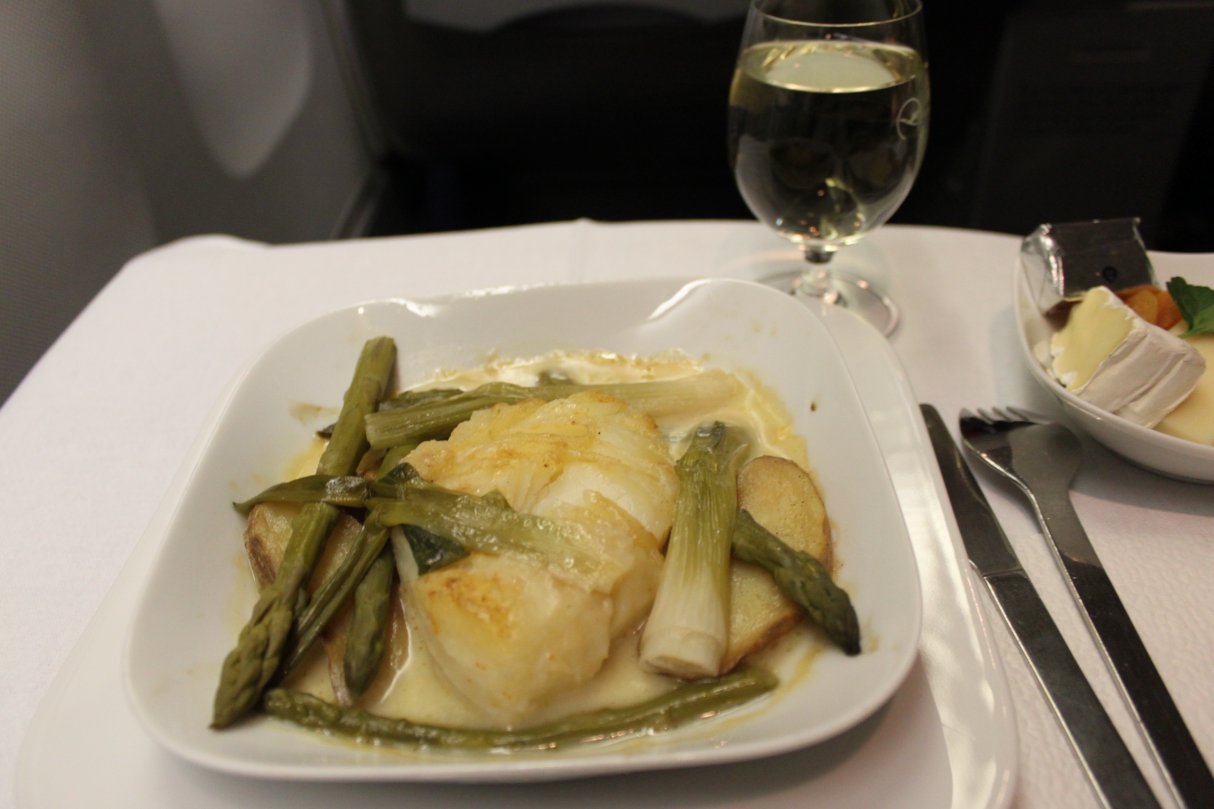 Tallriken togs bort och det var dags för huvudrätten. Tog Cod filet with Porange butter sauce, asparagus, green Onion and Fingerling Potato. Åts med en Grüne Weltiner. Tror det var första gången jag åt fisk ombord ett flygplan så smaken var väl sådär... Är man uppvuxen på västkusten så är man...