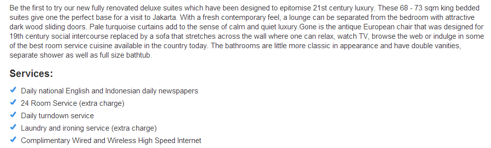 Jag slängde ihop 3 rum a´ 14 nätter nästa sommar. Tänkte att det kan vara kul att hänga med polarna i Jakarta. Grymt pris, dessutom ingår 20 dollar per dag att använda på hotellets restaurang/room service, dock bara till mat.