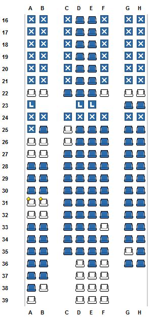 Jag skulle säga att alla de säten som är markerade med X är lediga - de är helt enkelt blockade för att de kräver extra betalning. Således borde SAS (eller du själv via sas.se) kunna välja AB eller GH på raderna 16-21 eller 24.