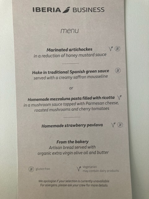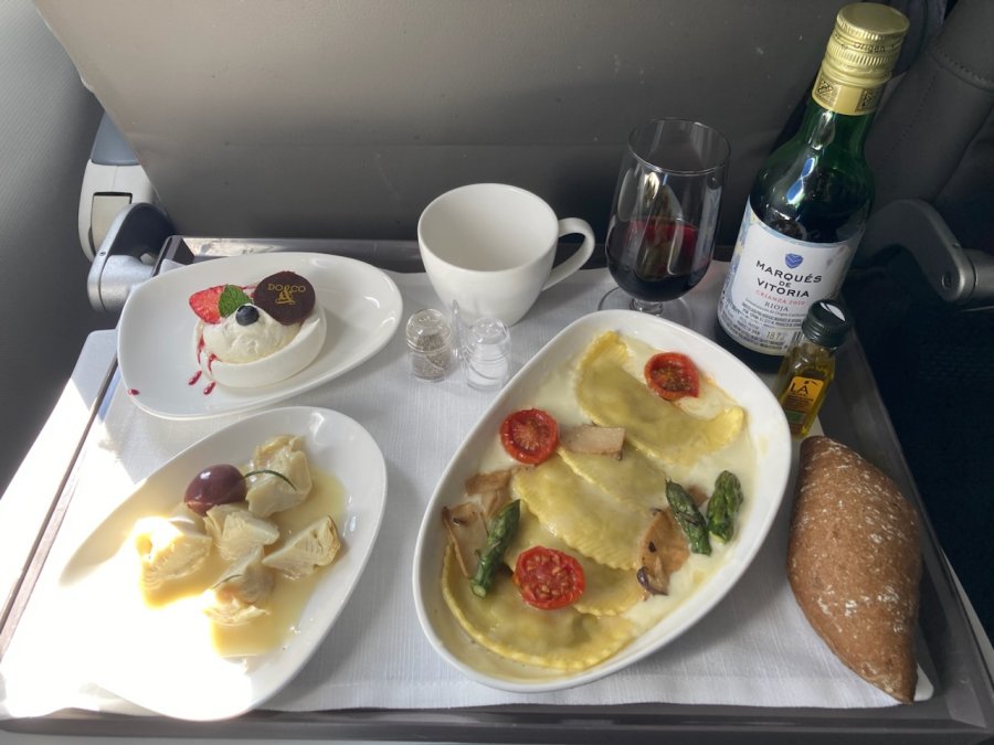 Presentationen av maten såg riktigt trevlig ut. Var det gott?Hälsningar (efter landning) från IB3169 LHR-MAD. Serveringen är trerätters på porslin med två val av huvudrätt, tog pastan. Det kom en liten chokladbit till kaffet efter jag tog fotot.