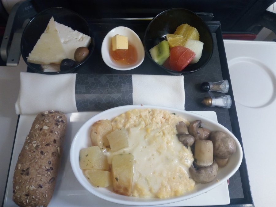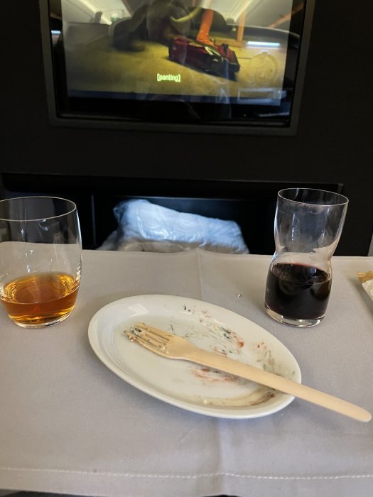 Rätt typisk IB Europa-upplevelse med rätt bra mat, helt ”korrekt” cabin crew men inte den där extra uppmärksamheten att fylla på i glaset m.m. som karaktäriserar deras systerbolag BA. (På en så här lång flight hade BA kört pre-dinner drycker och uttryckligen frågat om påfyllning under maten.) Jag lyckades dock få både cava, Rioja och brandy utan att ta till ”juiceknappen” genom att vara lite ”på” och förmodligen p.g.a. bara tre rader i biz. Men det var lite av ett undantag. Brandyn var en Gran Duque de Alba (från sherryhuset Williams & Humbert) som serverades från en bullig helflaska som de fick leta efter i bakre delen av planet. Fick minst en 8a i ett vinglas, kanske kompensation för de gånger det inte blivit tillfälle att beställa, eller så tycke pursern att det var lika bra att hälla rejält när han väl behövde leta upp flaskan.