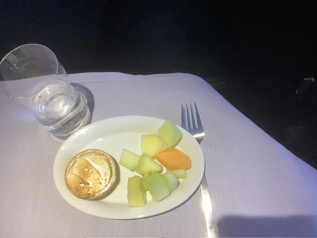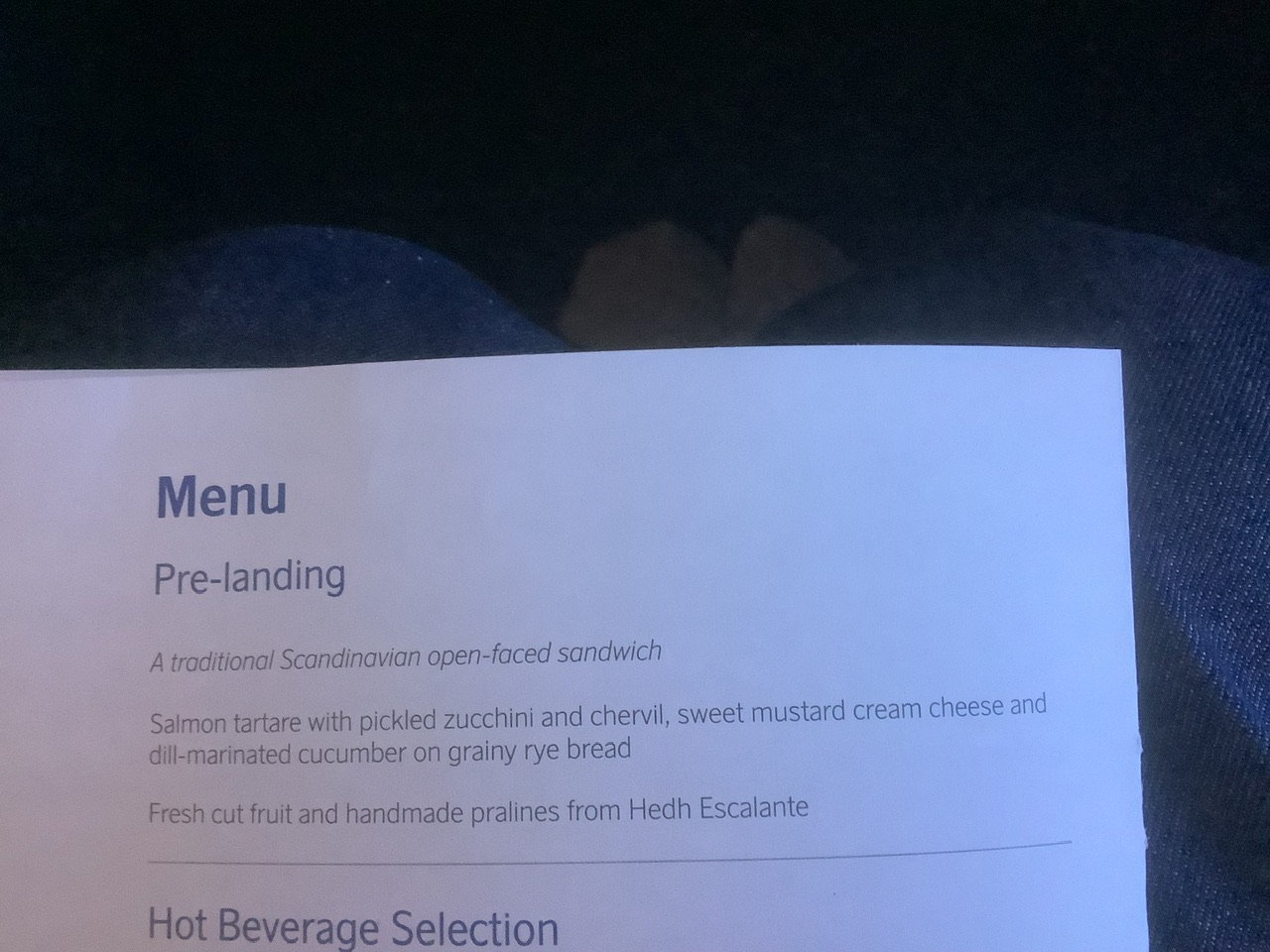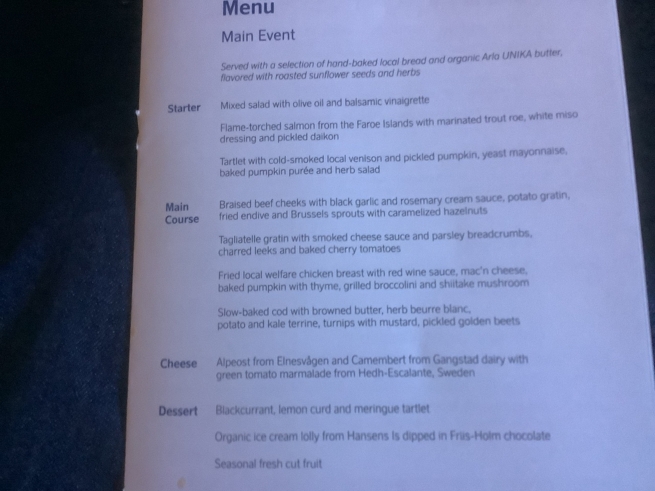 Först lax som smakade som lax på sushi, valde mellan pasta och kött, det blev tyvärr segt kött torr potatisgratäng.