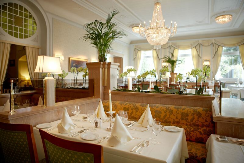 Restaurang och bar finns på första våningen. Just huvudmatsalen ”Grand Restaurant” är en magnifik matsal med stora kristallkronor och en sober inredning. De flesta gästerna bor med halvpension, dvs. frukost och middag intages i restaurangen. Servicen var oklanderlig och med tanke på att det är fem rätter som serveras, så var det mycket för personalen att hålla reda på. Vid varje matplats ligger en La Menu, på två språk, franska och tyska. De fem olika rätterna erbjuds dessutom med lika dubbla alternativ, så det finns stora möjligheter att komponera sin favoritmåltid. Naturligtvis är det olika menyer varje dag! En omfattande vinlista kompletterar utbudet. För de gäster som inte dricker ur sin vinflaska, så förses den med rumsnummer och man kan fortsätta dricka den nästa dag.