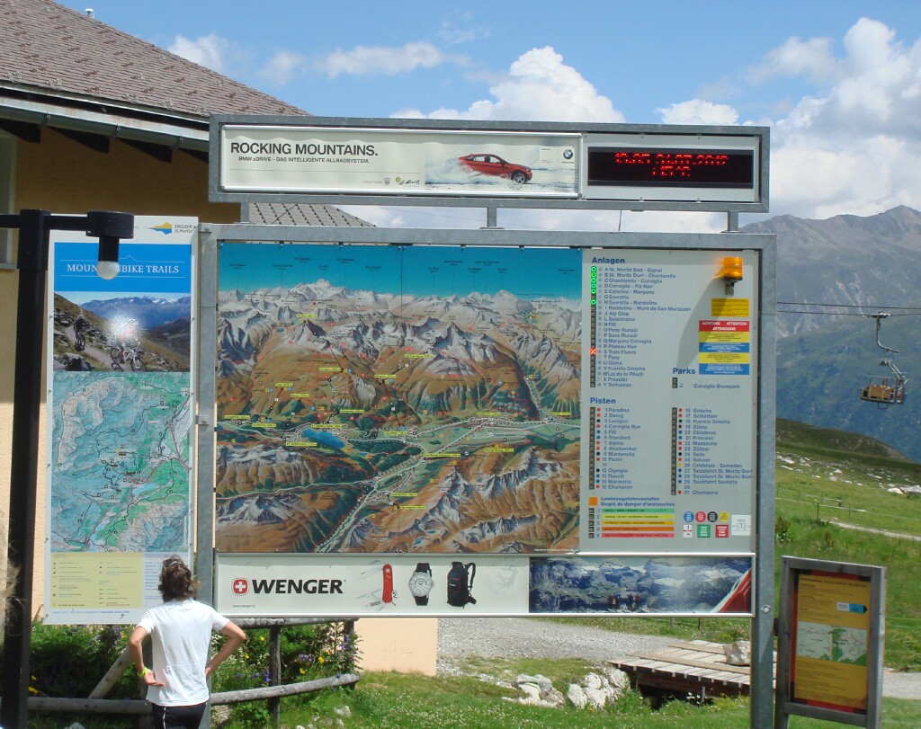 På flertal av bergsbanorna har man möjlighet att ta med sig cykeln, för sedan kasta sig ned för ’sluttningen’, såsom från Piz Nair 3057 m öh. ”The only way is up”, som det står på reklamskylten i bergsbanan.