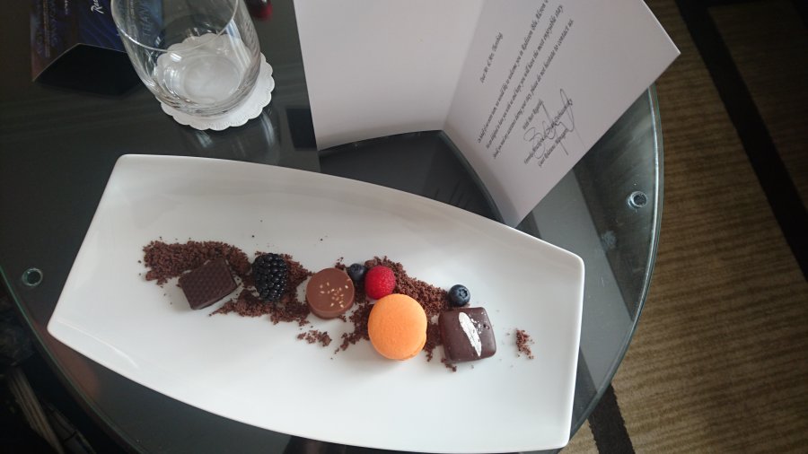 Efter ca 3 timmar kom personal upp med ett fat praliner samt ett välkomstbrev. Kändes som att de "kom på". Oavsett är det alltid en trevlig gest med "välkomstgåvorna".